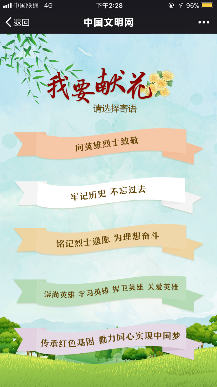 为了永远铭记为民族独立、人民解放和国家富强、人民幸福作出巨大贡献和牺牲的英雄烈士,在全社会树立崇尚英雄、缅怀先烈的良好风尚,营造传承英烈精神、奋进新时代的良好氛围,以奋发有为的精神状态迎接新中国成立70周年,从4月1日起,中央文明办三局、中国文明网启动“传承英烈精神立志报效祖国——网上祭英烈”网络文明传播活动。 广大网友可以通过中国文明网及微博、微信公众号(ID:wenmingcn)、“文明中国”客户端登录活动专区开展网上献花、留言寄语等活动,表达对英烈敬仰缅怀之情。