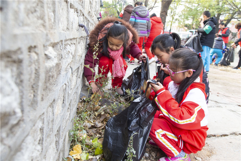青年志愿者们带领学生们打扫落叶、捡拾垃圾、清理路边小广告、向居民宣传“讲文明、护环境”。在志愿者们的引导和鼓励下,孩子们不怕脏、不怕累,笤帚扫不起来的地方,用手去捡,每位同学的垃圾袋里都装得满满的。
