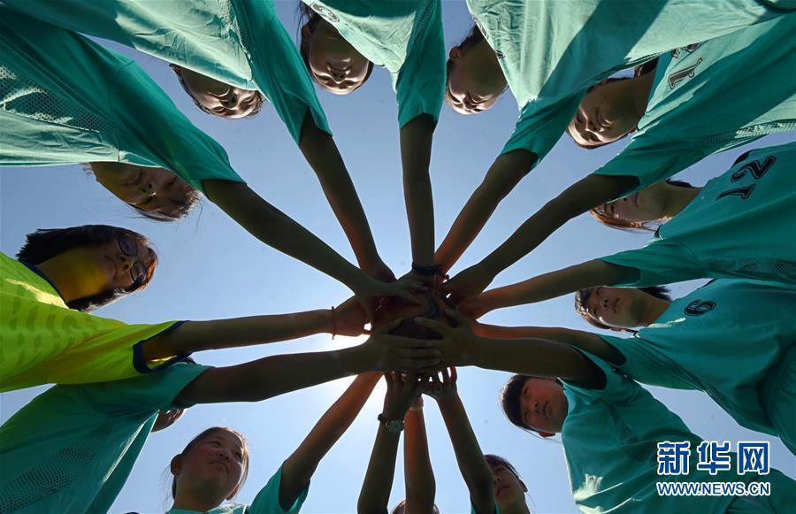 6月11日,孩子们在训练前相互加油鼓劲。新华社发(赵东山 摄)