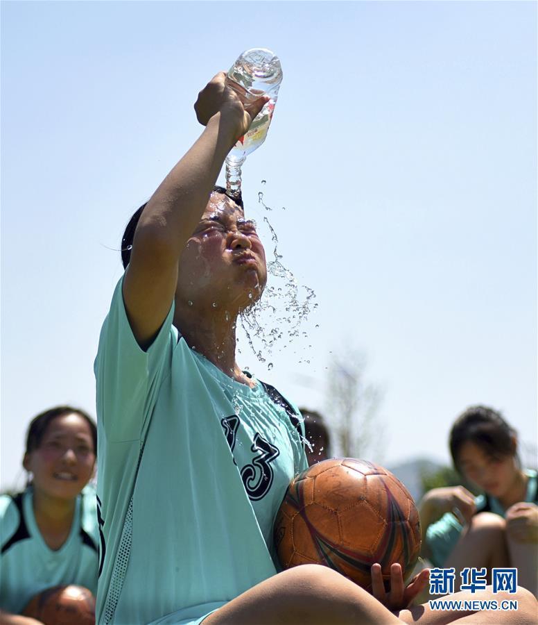 6月11日,一名队员在训练休息的间隙把水倒在脸上降温。新华社发(赵东山 摄)