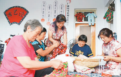 山东省沂源县东里镇充分挖掘乡村文化资源,用文化和传统创意激发活力。该镇下柳沟村通过流转闲置石头房屋,发展乡村旅游,吸引了许多人才回归村里创业。图为当地“布艺边”手工作坊入驻民俗街,让传统技艺在这里得以发扬和传承。