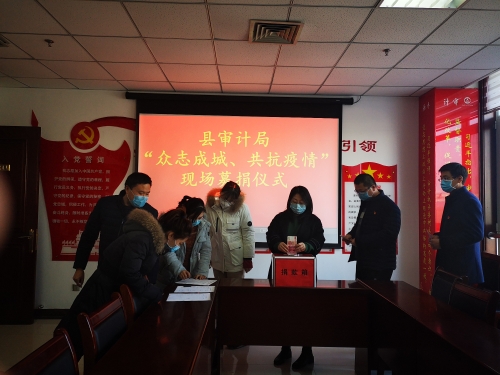 在新冠肺炎疫情防控的关键时期,为更好地支持湖北疫情防控,2月13日下午,沂源县审计局组织全体干部职工开展“众志成城 共抗疫情”爱心捐款活动。班子成员带头捐款,全体干部踊跃参加,以实际行动支持湖北疫情防控,为奋战在一线的防控人员加油,为疫情助力。本次捐款活动,61名审计干部共捐款21200元,募捐活动所募集资金统一转入县慈善总会账户和县红十字会账户,全部用于支持湖北抗击疫情防控工作。