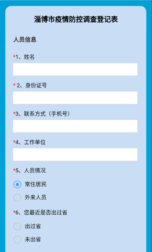 淄博市疫情防控调查登记二维码 (健康淄博公众号) 2、进入填报页面,按要求如实填写个人信息、居住地址信息,并完善详细地址(楼号、单元号、户号)。外来人员登记来淄博的目标区县、宾馆或居住地址。
