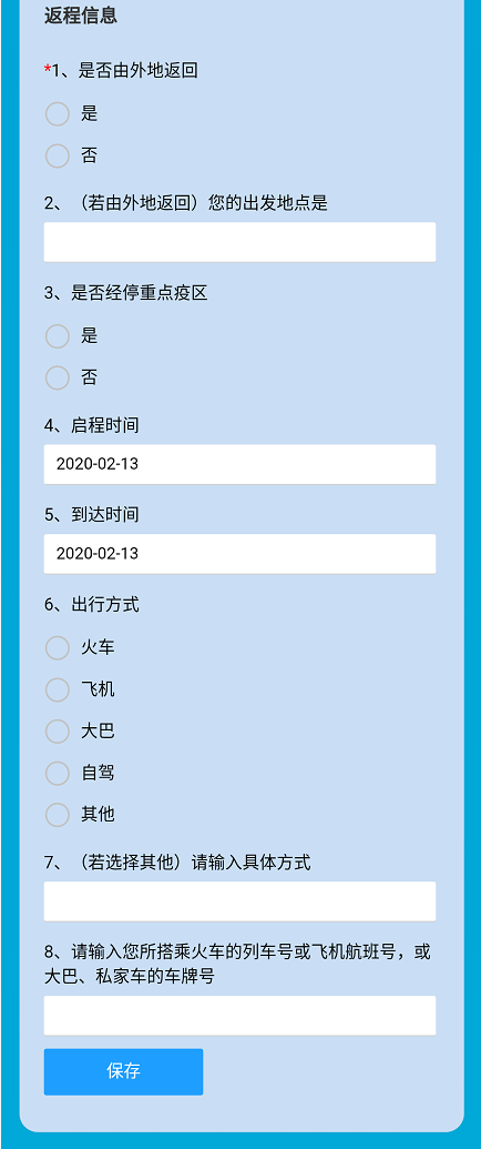 4、填写本人近期返程信息。信息填报完成后点击“保存”即可完成。