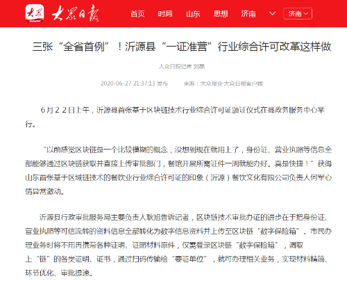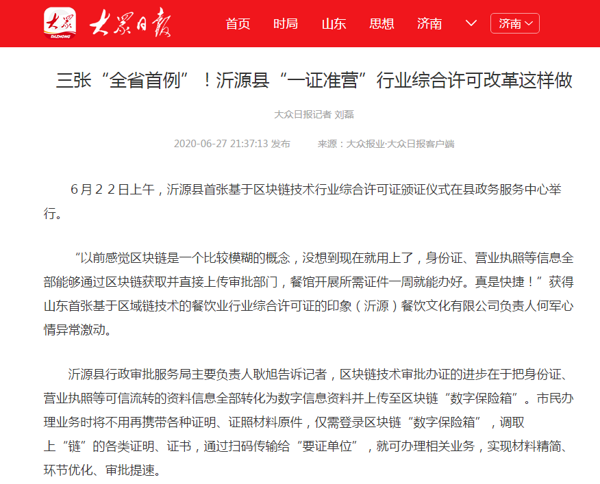来源:大众日报 6月22日上午,沂源县首张基于区块链技术行业综合许可证颁证仪式在县政务服务中心举行。 “以前感觉区块链是一个比较模糊的概念,没想到现在就用上了,身份证、营业执照等信息全部能够通过区块链获取并直接上传审批部门,餐馆开展所需证件一周就能办好。真是快捷!”获得山东首张基于区域链技术的餐饮业行业综合许可证的印象(沂源)餐饮文化有限公司负责人何军心情异常激动。 沂源县行政审批服务局主要负责人耿旭告诉记者,区块链技术审批办证的进步在于把身份证、营业执照等可信流转的资料信息全部转化为数字信息资料并上传至区块链“数字保险箱”。市民办理业务时将不用再携带各种证明、证照材料原件,仅需登录区块链“数字保险箱”,调取上“链”的各类证明、证书,通过扫码传输给“要证单位”,就可办理相关业务,实现材料精简、环节优化、审批提速。 以餐饮业“一业一证”为例,改革前群众需提交申请材料10份,运用区块链技术后申请材料减为8份,且申请表单中的数据大幅缩减。真正通过行业准入“政府侧”的刀刃内向改革,推动实现了从“以部门为中心”的单个事项改革转向“以企业为中心”的业务流程革命性再造。 尤为关注的是,沂源县此次发出的基于区块链技术行业综合许可证是继3月16日发出全省首张行业综合许可证后的第三张全省行业首例综合许可证,标志着沂源县率先将电子身份证、电子营业执照应用于政务服务领域后,又取得了区块链技术应用于“一业一证”改革领域的关键突破。 据了解,今年以来,沂源县以申请人眼中的“一次办成一件事”为目标,深入实施制度创新、流程再造,率先在全市启动了行业综合许可“一证化”改革试点,对首批试点15个行业的12个行政许可事项和行业综合许可变更、注销、补证等3个事项进行了标准化梳理,完成了首批15个行业27种具体情形办事指南和工作规程编制。同时对“行业审批条件、审批申报方式、审批受理流程、审批核查程序、审批审核模式、行业准营方式”6个方面进行了流程再造,分别实现“一次告知、一表申请、一窗受理、一次踏勘、一并审批、一证准营”。 颁发的“行业综合许可证”,加载集成具体许可内容的二维码,实现行业经营许可信息一码覆盖,二维码载明信息与单项行政许可同步变更。社会公众和监管部门可通过手机扫码查询获知。 截至目前,沂源县共有药店、便利店、电影院等6个行业的30家企业享受到了“一业一证”改革红利,未来还将覆盖更多行业,惠及更多企业。 | |||