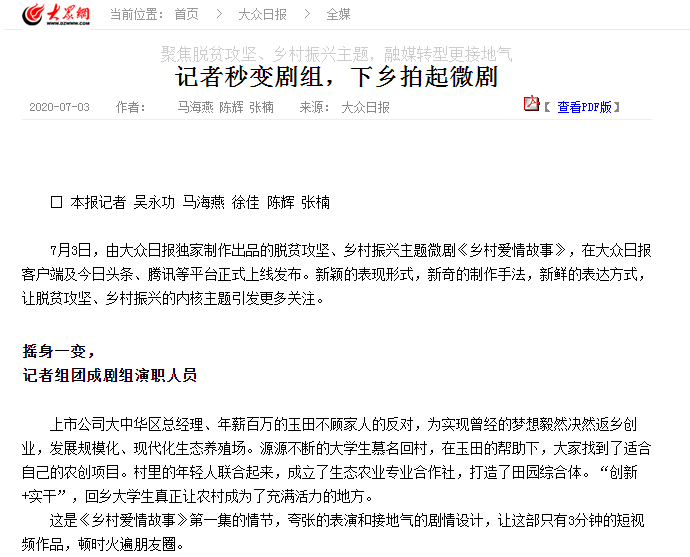 7月3日,由大众日报独家制作出品的脱贫攻坚、乡村振兴主题微剧《乡村爱情故事》,在大众日报客户端及今日头条、腾讯等平台正式上线发布。新颖的表现形式,新奇的制作手法,新鲜的表达方式,让脱贫攻坚、乡村振兴的内核主题引发更多关注。 摇身一变,记者组团成剧组演职人员 上市公司大中华区总经理、年薪百万的玉田不顾家人的反对,为实现曾经的梦想毅然决然返乡创业,发展规模化、现代化生态养殖场。源源不断的大学生慕名回村,在玉田的帮助下,大家找到了适合自己的农创项目。村里的年轻人联合起来,成立了生态农业专业合作社,打造了田园综合体。“创新+实干”,回乡大学生真正让农村成为了充满活力的地方。 这是《乡村爱情故事》第一集的情节,夸张的表演和接地气的剧情设计,让这部只有3分钟的短视频作品,顿时火遍朋友圈。 大众日报在策划脱贫攻坚、乡村振兴题材的新闻报道时,不仅要求采编人员图文、视频一体化融合运作,而且鼓励采编人员跳出新闻报道本身考量如何提升主题报道的传播力。在此背景下,今年全国“两会”期间以“民法典系列情景剧”火了一把的记者们,将视野放得更宽广,考虑从室内情景剧创作转为外景拍摄微电影、微网剧。 5名记者组建了临时剧组,一番头脑风暴后,大家确定从5个角度讲好脱贫攻坚、乡村振兴山东故事。接下来,5人分头行动,分别承担5集编剧的任务,同时负责对应各集的导演、拍摄和后期制作工作。团队中2名记者还是男女主角。在端午节前两天,这个“五脏俱全”的小规模剧组,带着拍摄设备和剧本从济南出发,直奔外景地淄博市沂源县朱家户。 树牢用户思维,融媒转型更要接地气 外景拍摄地是个山村,大众日报拍摄团队的到来,让村民们十分兴奋。大家好奇,党报的记者们,“不务正业”能干出什么大事?接下来几天,剧组的敬业和吃苦精神,让村民们纷纷竖起了大拇指。在拍摄间隙,剧组多次沟通,就剧本设计、现场表演和后期制作问题反复推敲打磨,达成的最大共识就是一定要树立用户思维,不自说自话,拍出来的视频要让大家看得进去。 剧组讲述的故事也让村民们大加褒奖。除了第一集讲述大学生返乡创业的故事之外,其余四集也紧密结合农村的实际,分别从“第一书记”扎根农村谋发展、绿水青山就是金山银山、农村青年迷上直播成带货网红、旧民居变民宿成产业新支柱等角度,讲述了山东美丽宜居乡村里的新变化。 比如在第三集中,柳莺和玉田这对小夫妻,因为家里煤矿被关停而发生了摩擦,经过一番思前想后,“矿主”玉田终于想通,走上绿色发展之路。在第四集中,一心想当网红的柳莺天天忙活自己的直播间,玉田忍无可忍,两人爆发了冲突。经过一番矛盾冲突后,找准定位的柳莺终于成了村里的直播带货网红。 因为剧本接地气,所以拍摄过程比较顺利。拍摄过程中,村民们反复说,讲述的故事接近农村的真实情况,有说服力。此外,剧组边拍边思考,邀请多名村民友情客串。友情出演的村民上至80多岁的老奶奶,下到二年级的小学生,他们的本色演出,让微剧更加出彩。