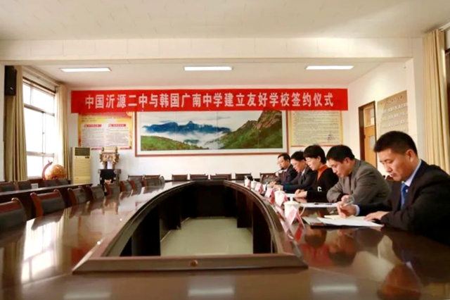 仪式上,沂源二中与韩国京畿道广南中学分别播放了各自的学校宣传片;双方校长通过远程视频分别致辞,介绍了学校的校园文化、发展目标及建立友好学校的喜悦;双方签订了《建立友好学校关系备忘录》,约定在今后教学交流、教育考察、访问交流、学术交流、学生交流互动等方面开展多形式交流合作。