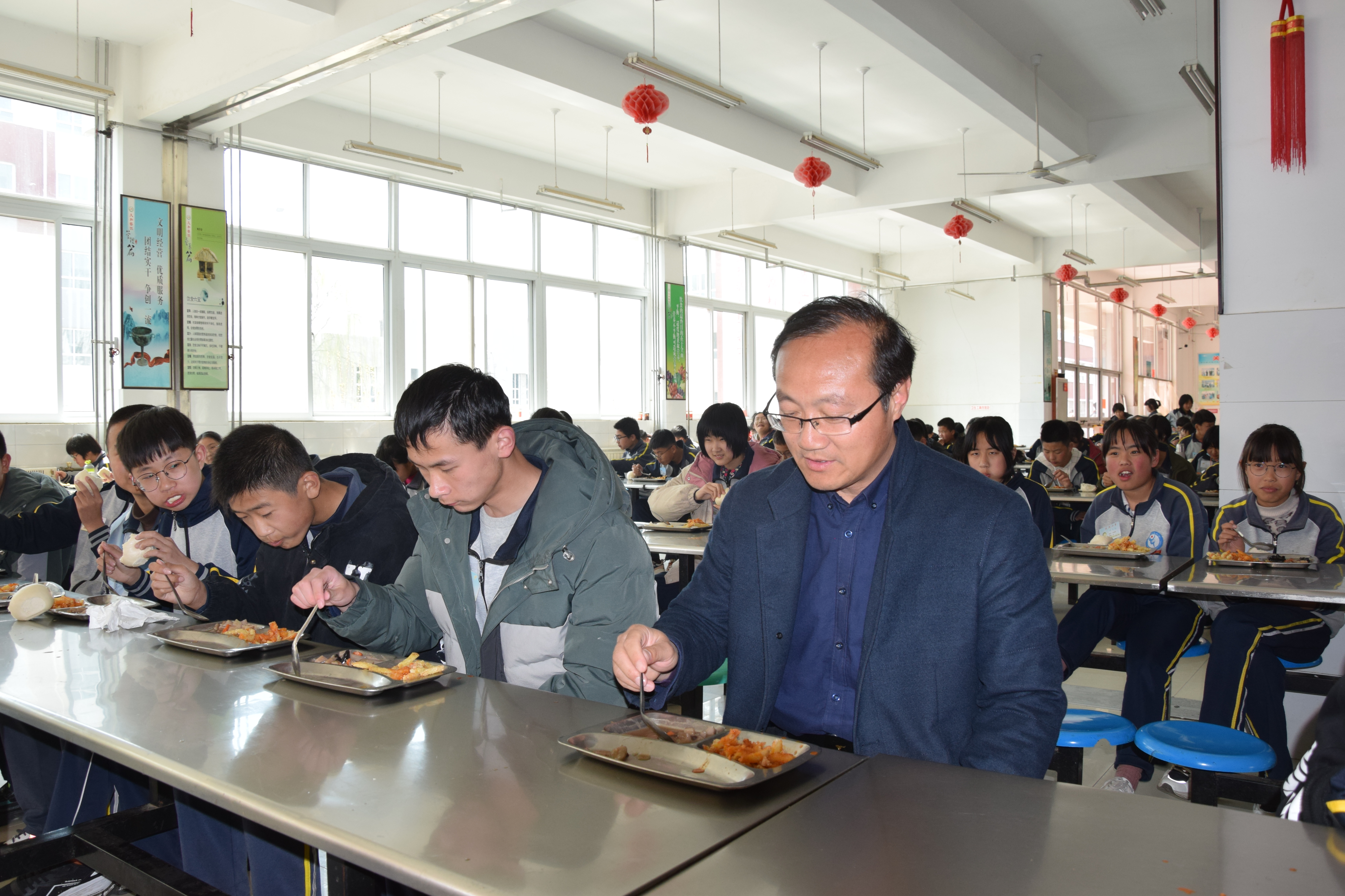 为落实市县校长陪餐工作要求,悦庄镇学区各学校实行“校长、班主任陪餐制”,严格执行统一配餐,校长、班主任陪餐管理制度,打造“学生舌尖上”的安全校园,守护校园食品安全。 悦庄镇学区各学校坚持推行“校长、班主任陪餐制”。校长每周至少三次陪餐,班主任做到天天陪餐。每次进餐时,值班领导提前10分钟进入食堂,检查食品卫生,饭菜质量、数量以及温度,检查时采取一看、二闻、三尝的流程,同时做好相关记录。然后班主任、教师同学生一起有序进餐厅进餐,确保学生吃饱吃好。 “校长、班主任陪餐制”不仅是陪学生一起用餐,更是陪伴学生健康成长,让每个学生都能在校吃得健康、吃得舒心,让家长放心。(张仁春)