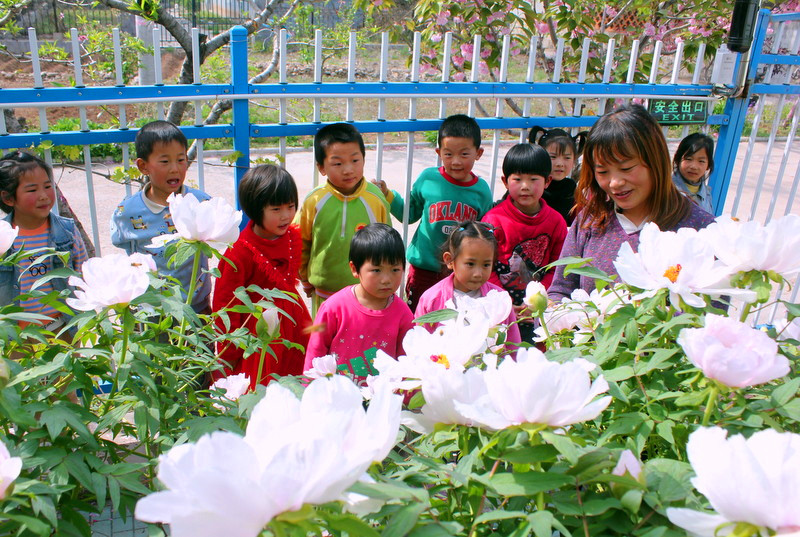 4月27日,南鲁山镇三岔幼儿园的老师和小朋友在校园里赏花。花开春暖,正是赏花好时节。