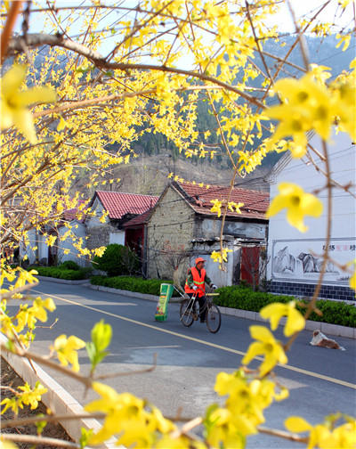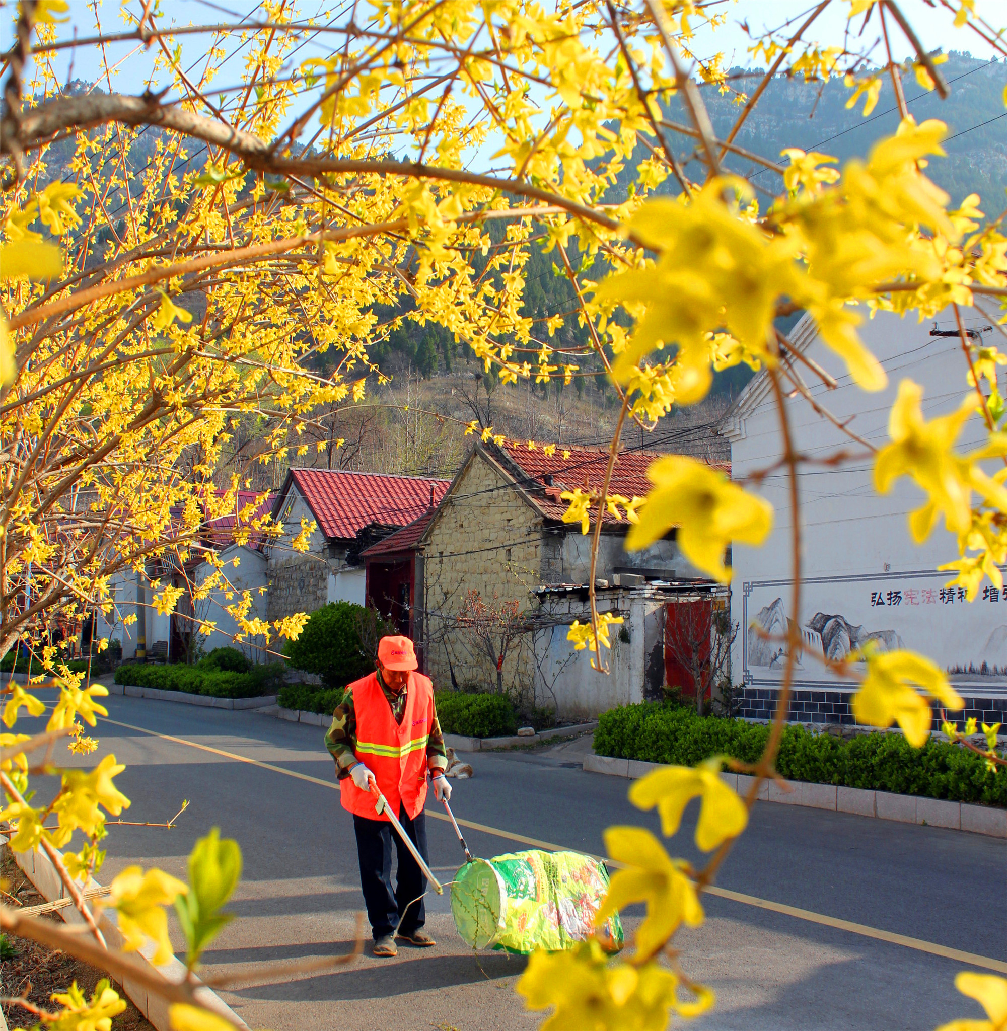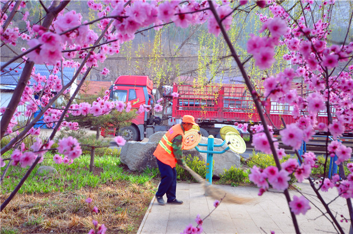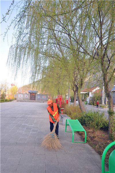 4月6日,沂源县南鲁山镇土门村保洁员清扫街道。