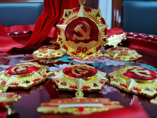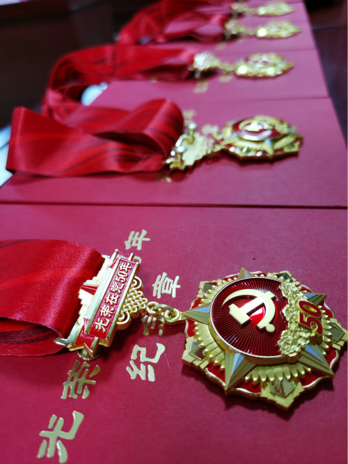 百年征程波澜壮阔,五十余载初心不改。 6月29日,沂源县卫生健康局举行“光荣在党50年”纪念章颁发仪式,8名50年党龄的老党员代表、县卫生健康局全体党组成员和机关党员干部参加颁发仪式。 县卫生健康局党组书记、局长高贵明代表局党组,向获得“光荣在党50年”纪念章的老党员表示热烈祝贺和崇高敬意,逐一为老党员佩戴“光荣在党50年”纪念章,并送上慰问品和鲜花。 参加仪式的老党员纷纷表示,在建党百年获颁纪念章,既是荣誉也是责任,将以颁发纪念章为新起点,把荣誉化为力量,不忘初心、牢记使命,感党恩、听党话、跟党走,把光荣传统弘扬好,把老党员作用发挥好,以实际行动为党旗增光添彩。 对未能到现场参加颁发仪式的老党员,局党组成员专程上门送去“光荣在党50年”纪念章并送上慰问品,对他们表示祝贺和致意。 “光荣在党50年”纪念章通径为50毫米,材质为铜和锌合金,主色调为红色和金色。主章由党徽、五角星、旗帜、丰碑、向日葵、光荣花、光芒等元素构成。 其中党徽象征党的领导核心地位和党员信念坚定、对党忠诚;丰碑寓意党的光辉历程和丰功伟绩;向日葵寓意全党全国各族人民紧密团结在党中央周围;光芒象征党的光辉照耀;五角星代表薪火相传;光荣花寓意繁荣盛世、国泰民安和褒奖荣耀;旗帜象征共产主义崇高理想与事业永续。副章由山河、中国结和红飘带等元素组成,飘带上雕有“光荣在党50年”字样,寓意党员不忘初心、牢记使命,勇攀高峰、永葆青春。(王富艳) | |||