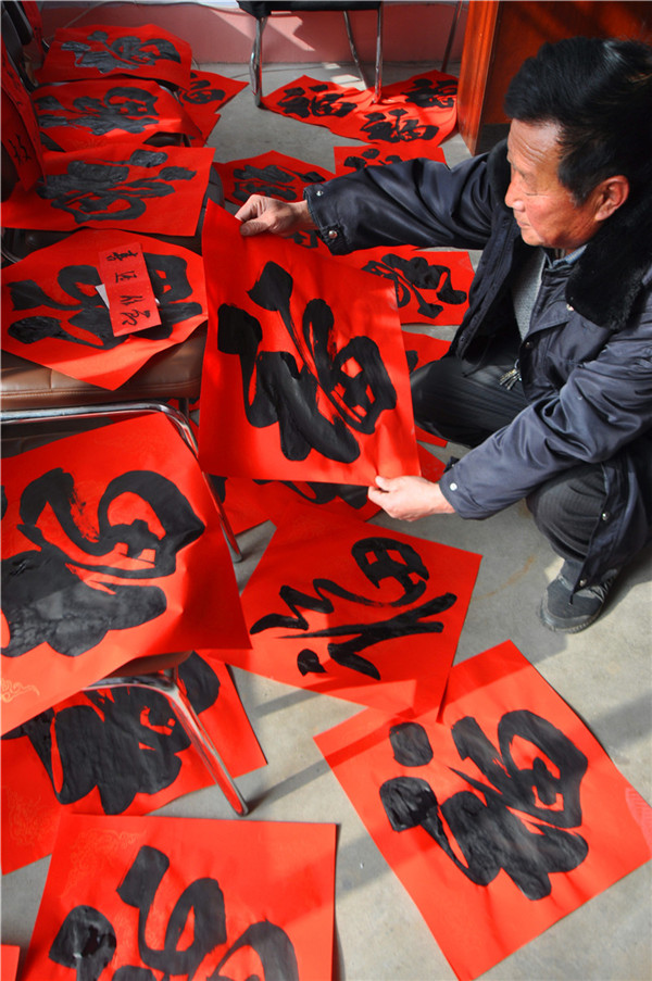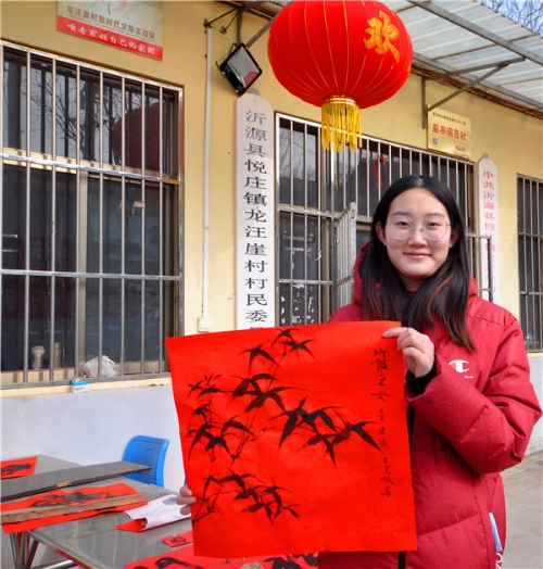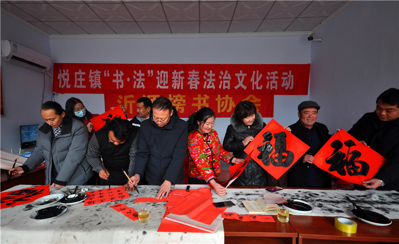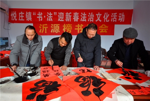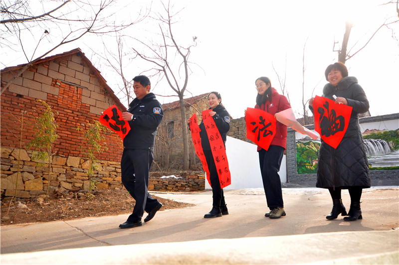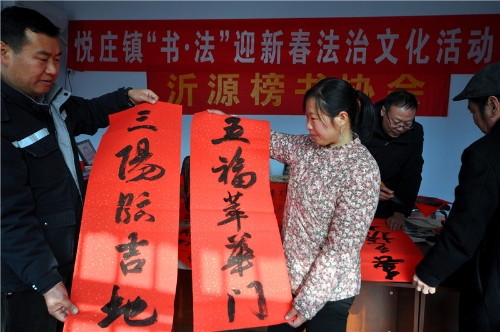 “老师,您给我写一副带福字的春联吧,借着您送春联的机会,沾沾福气,希望2022年的日子更加红红火火!” 专门来村委大院看书法凑热闹的张大哥幸福地说。 1月20日,沂源县榜书协会的书法家们一大早来到沂蒙山深处的沂源县悦庄镇龙汪崖村,开展“迎新春文化下乡送春联”活动。一上午,书法家们为乡亲们书写了300余副的春联和福字,让乡亲们提前感受到春节的喜庆氛围和浓浓的年味。 为减轻村经济负担,县下派龙汪崖村第一书记刘阳的单位——沂源供电公司大力相助,提前准备好了墨和纸张。 “春临大地百花艳 节至人间万象新”、“一年四季行好运 八方财宝进家门”,一副副洋溢着新春祝福的春联,在各位书法家饱蘸热情的笔端下精彩呈现,也充分表达了广大人民群众感恩祖国、热爱家乡、喜迎佳节的美好愿望。(陈作进) | |||