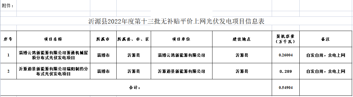 附 件:沂源县2022年度第十三批无补贴平价上网光伏发电项目信息表
