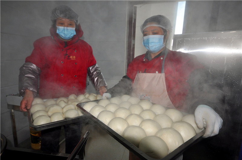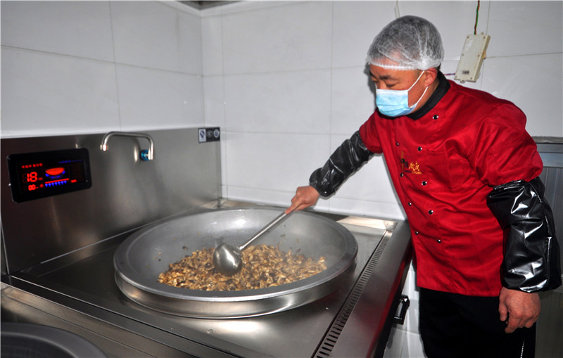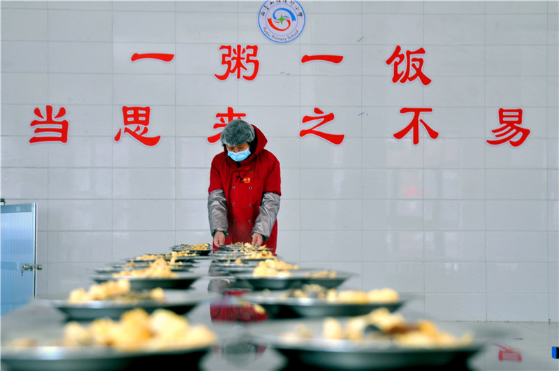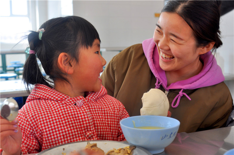 3月1日,沂源县南鲁山镇璞邱小学的小学生在老师的陪护下吃午饭。