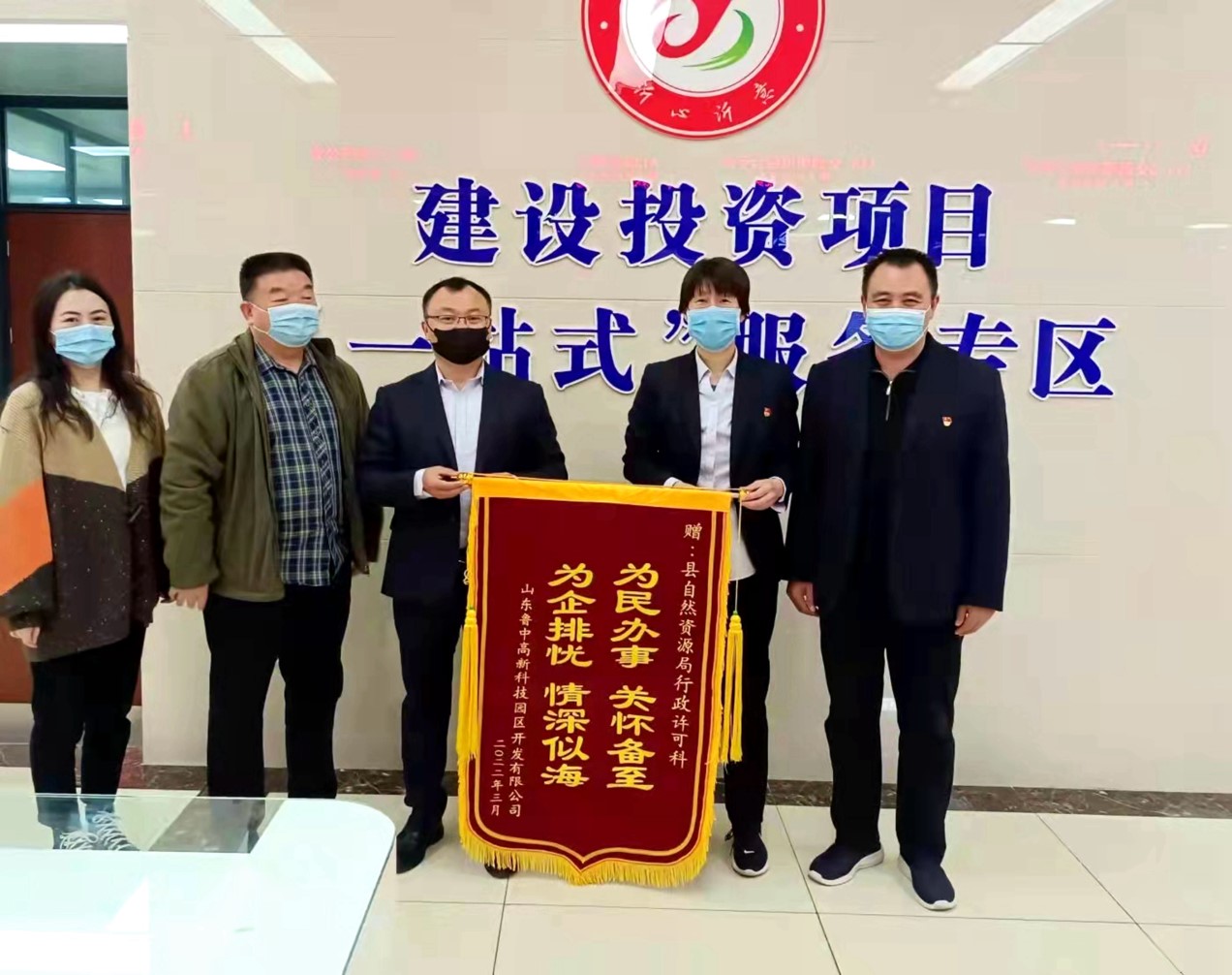 3月24日,在淄博市沂源县政务服务大厅的自然资源局行政许可窗口,山东鲁中高科科技园区开发有限公司送来了锦旗,上书“为民办事关怀备至,为企排忧情深似海”,十六个金色大字由衷表达了鲁中高科公司对自然资源局行政许可专班人员“疫”路护航,助推企业“多拉快跑”的感激之情。 近期,疫情卷土重来,沂源县自然资源局全员响应号召,就地转志愿者到小区卡口24小时轮岗值勤,此时,鲁中高新科技园开发有限公司的儒林社区改造项目二期工程的行政许可事项进入审核流程,按下暂停键,不但会影响该项目及时落地,更会影响后期的进度。 鲁中高新科技园开发有限公司申请办理的儒林社区改造项目二期工程选址和规划行政许可,属沂源县民生项目重点工程,位于沂源县人民路以西,新城路以南,涉及住宅楼20座及综合服务中心、幼儿园、社区内道路等配套设施,占地总面积120多亩,建筑总面积近17万平方米。 该项目工期紧,任务重,沂源县自然资源局“疫”路担当,为企业护“航”,在人员少、时间紧、疫情防控上满“弦”的情况下,针对鲁中高科的实际情况,安排行政许可工作人员成立专班,专人负责,一站式服务该项目的各类行政许可事项,助推企业“多拉快跑”。 行政许可专班人员采取上门取件、调度协调相关科室、及时整理资料等方式,用三天的时间为鲁中高科办理了五书十证,其中建设用地预审与选址意见书五本,建设用地规划许可证和工程规划许可证各五本。最大限度地保障了儒林社区改造项目二期工程的及时开工,得到了企业的高度赞誉。 | |||