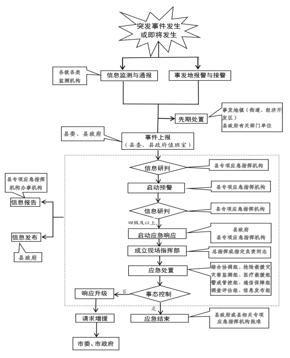 在县委统一领导下,县政府是全县突发事件应急管理工作的最高行政领导机关。在县长的领导下,通过县政府常务会议研究、决定和部署突发事件应急管理工作。当发生一般及以上突发事件,由县委、县政府决定成立总指挥部,统一领导、组织指挥应对工作。