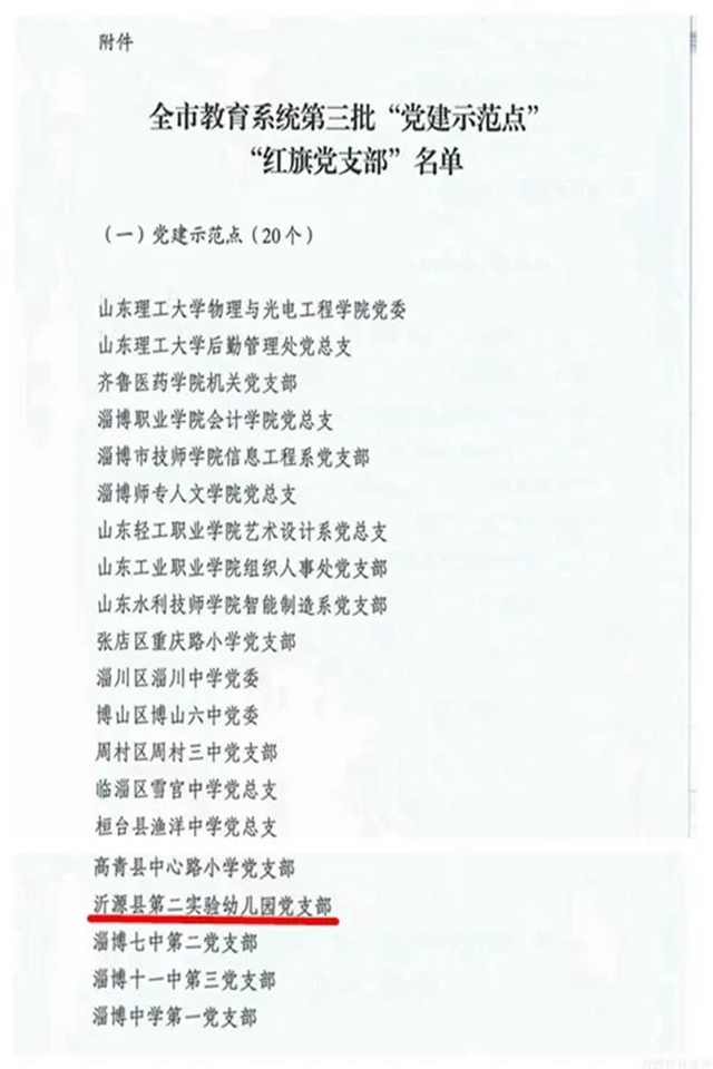 近日,中共淄博市委教育工作委员会印发了《关于公布第三批全市教育系统“党建示范点”“红旗党支部”名单的通知》,沂源县第二实验幼儿园党支部荣获“党建示范点”荣誉称号,沂源县实验幼儿园党支部、沂源县鲁阳小学党支部、沂源县鲁村镇中心小学党支部荣获“红旗党支部”荣誉称号。 下面,请随小编一起看看县第二实验幼儿园的党建风采吧!!! 县第二实验幼儿园:党建引领 成就更好的学前教育 县第二实验幼儿园党支部坚持党建引领,始终以新思路、新机制、新手段推进党建工作实施,努力实现党建工作与日常工作有机融合,充分发挥党组织的战斗堡垒作用和党员先锋模范作用,助推学前教育高质量发展。 党建引领—打造高素质党员干部队伍 在党建引领下,从支部建设到党员队伍,形成团结协作、默契配合,共谋发展的团队;实施党员积分制管理,抓党员队伍,亮承诺、做表率。本年度,7名党员骨干教师以自身专长进行了培训,并进行示范课授课10余节。高素质的党员干部队伍真正起到了以上率下,以先促后,以老带新,推进所有教职工同发展、共进步。