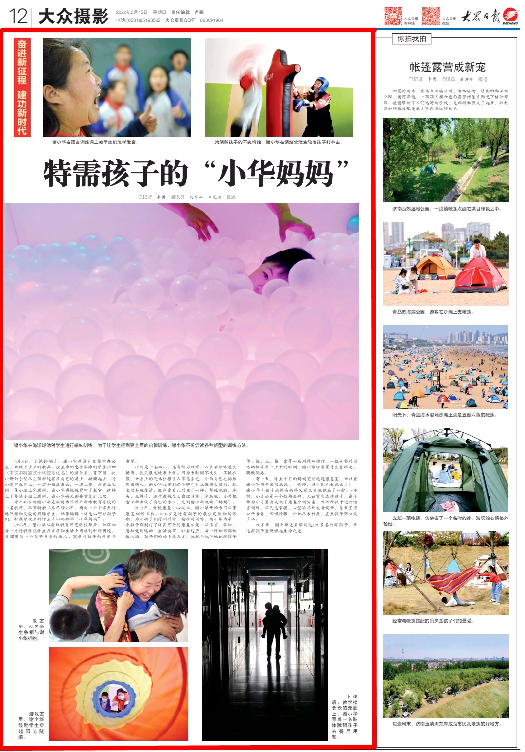 5月8日,下课铃响了,谢小华并没有直接回办公室,她放下手里的教具,径直来到患有脑瘫的学生小珊(本文中特需孩子均使用化名)的座位前,弯下腰,把小珊的手臂从头顶拉过搭在自己的肩上,挺腰起身,将小珊背在背上,一边和她说着话,一边上楼,走进卫生间。等小珊上完厕所,谢小华再把她背回了教室。这样上下楼陪小珊上厕所,谢小华每天都要重复好几次。 今年48岁的谢小华是淄博市沂源县特殊教育学校的一名教师,从事特教工作已经26年。面对一个个需要特殊照顾和关爱的残障学生,她像妈妈一样悉心呵护孩子们,特教学校里的师生亲切地称她“小华妈妈”。 1995年,谢小华从特殊教育师范学校毕业,她深知每一个特教学校学生在学习和生活上面临的种种困境,更理解每一个孩子身后的亲人、家庭对孩子的疼爱与希望。 小雨是一名孤儿,患有智力障碍,入学后经常蓬头垢面、披头散发地来上学。因为长时间不洗头、不换衣服,她身上的气味让很多人不愿靠近,小雨自己也排斥周围的人。谢小华注意到这个脾气有点倔的女孩后,就主动和她接近,像疼爱自己的孩子一样,帮她洗脸、洗头、扎辫子,逐步教她生活自理技能。渐渐地,小雨把谢小华当成了自己的亲人,见到谢小华就喊“妈妈”。 2013年,学校康复中心成立,谢小华开始专门从事康复训练工作。0-6岁是特需孩子的最佳发展和训练期,为让孩子们得到科学、精准的训练,谢小华为每一个孩子都制订了详实可行的康复方案,从语言、认知、感知觉到运动、生活自理、社会适应,每一种训练都细致入微。孩子们的动手能力差,她就手把手地训练孩子伸、握、拉、推、拿等一系列精细动作,一组完整的训练动辄需要一上午的时间,谢小华经常累得头昏眼花、腰酸腿疼。 有一天,学生小月的妈妈突然跑进康复室,她拉着谢小华的手激动地说:“老师,孩子能和我说话了!”谢小华和孩子妈妈高兴得又哭又笑地抱在了一起。3年前,小月还是一个性格孤僻、无语言交流的孩子。谢小华为小月量身定制了康复个训方案,天天陪孩子进行语言训练,从气息掌握、口型矫正到发音说话,每天累得口干舌燥、咽喉肿胀,但她从未放弃,直至孩子张口说了话。 26年来,谢小华先后帮助过120多名特需孩子,让这些孩子重新燃起生命之光。 | |||