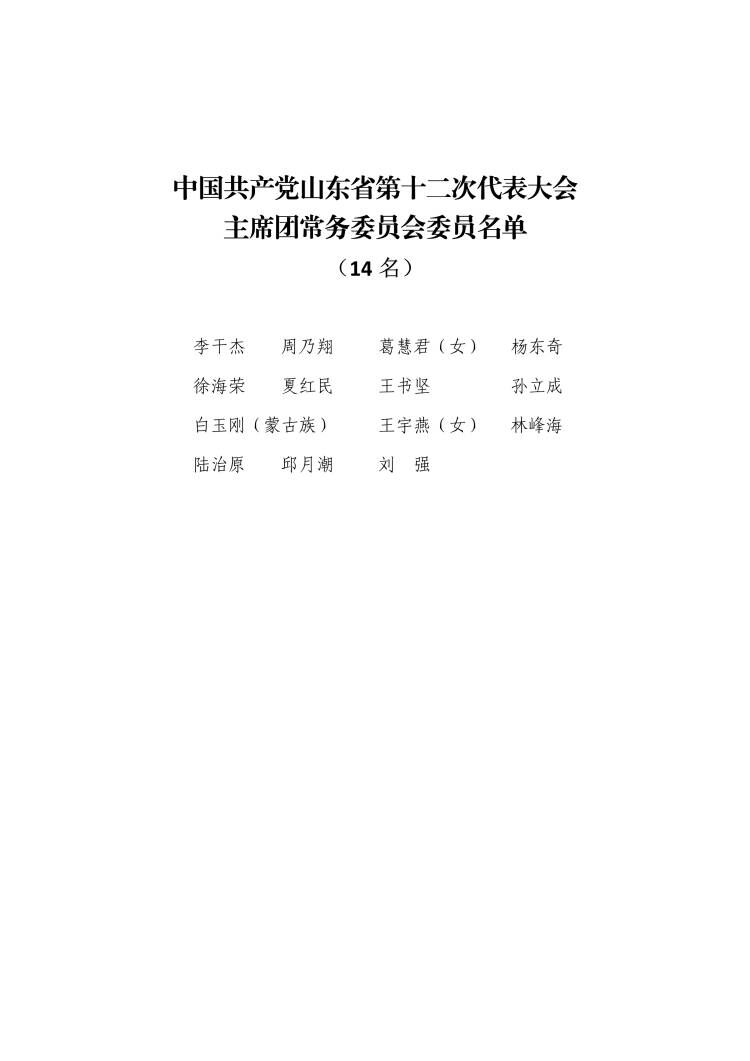 中国共产党山东省第十二次代表大会主席团常务委员会委员名单