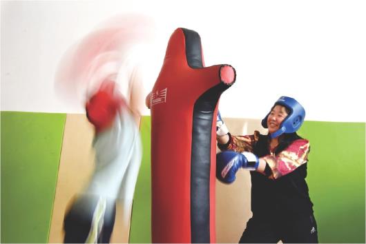 为消除孩子的不良情绪,谢小华在情绪宣泄室陪着孩子打拳击。