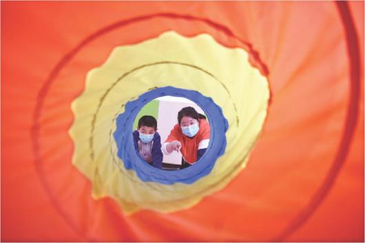 游戏室里,谢小华鼓励学生穿越阳光隧道。