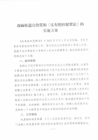 南麻街道充分发动各村(居)、社区开展普法宣传,掀起宣传热潮,营造学习氛围,提高全社会知晓度,增强人民群众运用法律武器同黑恶势力作斗争的意识,推动常态化扫黑除恶斗争走深走实,实现城乡更安宁、群众更安乐。 南麻街道印发宣传贯彻《反有组织犯罪法》的实施方案 街道通过悬挂宣传横幅、发放宣传图册、讲解知识亮点等方式,全方位宣传《反有组织犯罪法》等法规政策,并现场接受群众咨询,引导群众遵守法律法规,鼓励群众积极踊跃检举揭反有组织犯罪线索,积极参与到常态化扫黑除恶中。