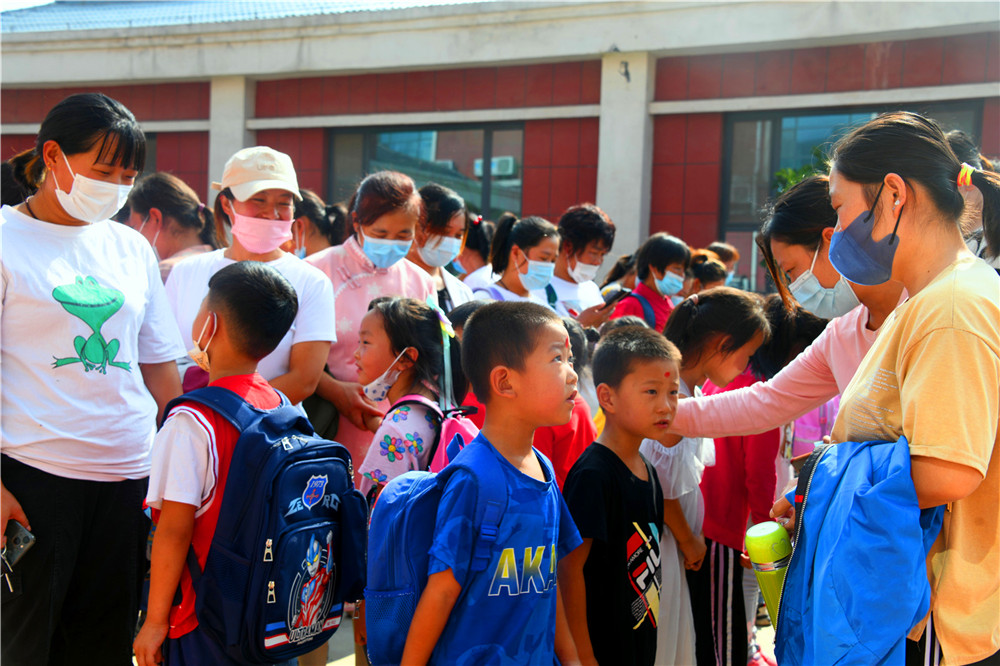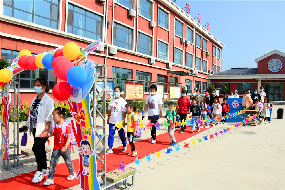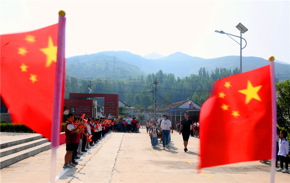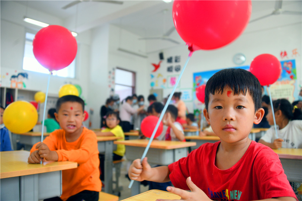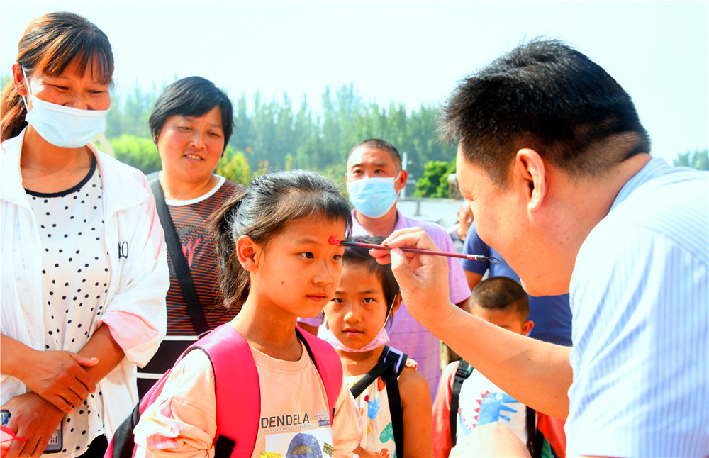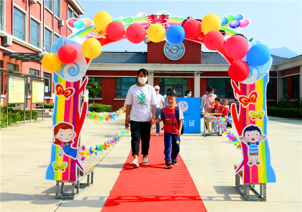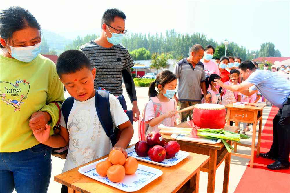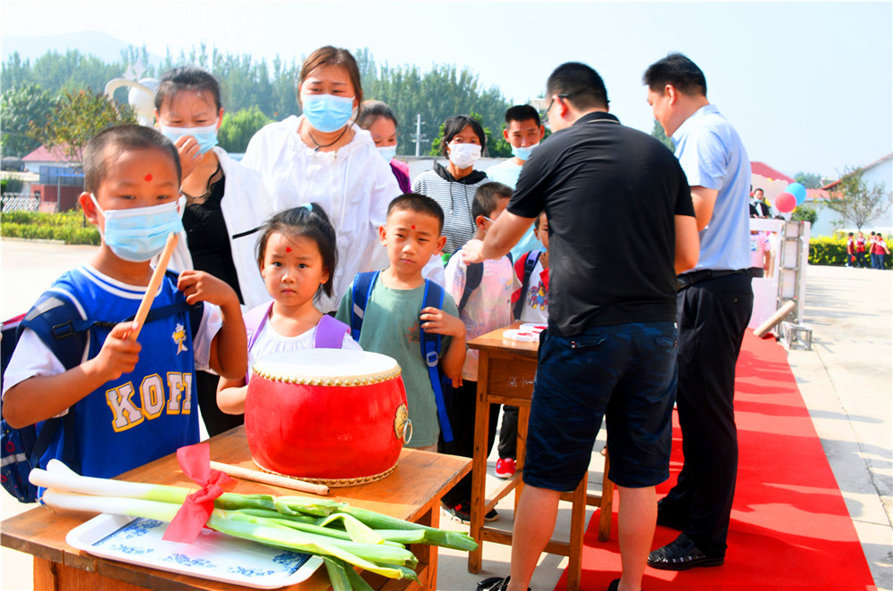 9月6日,大山里的沂源县南鲁山镇璞邱小学的校园里,新入学的孩子们在父母的牵领下,走过红毯,在师生们的欢迎声、掌声中,摸大葱、拿苹果、点朱砂、击鼓鸣志,行拜师礼、正衣冠、感恩父母,仪式感满满。
