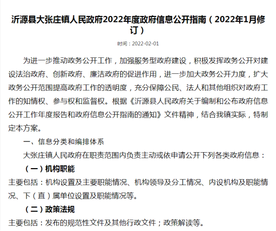 根据《中华人民共和国政府信息公开条例》和《山东省政府信息公开办法》,结合大张庄镇政府信息公开工作实际,现向社会公开大张庄镇2022年政府信息公开年度报告。 本报告中所列数据的统计期限自2022年1月1日起至2022年12月31日止。公民、法人及其他组织需要查询报告中相关政府信息公开工作事项或对本报告有任何疑问的,请与沂源县大张庄镇人民政府党政办公室联系。(地址:沂源县大张庄镇人民政府;邮编:2561114;电话:3611001;传真:3611008;电子邮箱:yyxdzz@zb.shandong.cn) 一、总体情况: 2022年,大张庄镇政府信息公开工作在县政府大数据中心的业务指导下,深入贯彻落实《中华人民共和国政府信息公开条例》,坚持围绕中心、服务大局的工作原则,结合辖区工作实际,不断加强政务公开工作力度,及时、准确地向社会公开政府信息,保证了行政权力的公开透明运行。 (一)主动公开内容: 我镇严格按照《政府信息公开条例》第二十条之规定和上级指示要求的法定主动公开内容。公开河长制工作、城乡环境大整治、民生政策落实、安全生产、脱贫攻坚等重点难点工作信息45条次,并定期进行更新,同时,公开了政府各部门和各站所的工作职责、办事依据、办事流程、办结期限、办结结果、监督办法及人民群众关注的其它难点、热点问题。 (二)依法申请公开情况: 严格按照《中华人民共和国政府信息公开条例》关于依法申请公开信息情况规定,及时办理公开申请,保障公民、法人和其他组织依法获取政府信息,充分发挥政府信息对人民群众生产、生活和经济社会活动的服务作用。 (三)政府信息管理情况 大张庄镇坚持以公开为常态、不公开为例外的原则,依法依规做好公开工作。涉及公民、法人和其他组织权力和义务的规范性文件,按照《中华人民共和国政府信息公开条例》的规定,全面、准确、及时做好公开工作。不断加大政策解读力度,积极回应社会关切,发挥正面引导作用,提升政务服务效能。主动、及时、全面、准确地发布权威政府信息,推进行政决策公开、执行公开、管理公开、服务公开和结果公开。 (四)政府信息公开平台、机构建设和人员情况 大张庄镇高度重视政府信息公开工作,副镇长担任政府信息公开领导小组组长,下设办公室,专门配备了信息公开工作人员2名,其中专职信息公开工作人员1名。有专人负责信息公开网站的维护和信息发布工作,及时做好网上投诉案件办理、答复工作,保障政府信息公开工作有序运行。 (五)监督保障情况 大张庄镇不断完善镇政府信息公开保密审查制度、政府信息公开责任追究制度和依申请政府信息按时公开制度,并抓好各项制度的督查落实。建立健全政府信息公开工作考核评议制度,强化问责,不断改进工作。建立政府信息公开举报办理工作制度,强化信息公开工作主管部门的监督职责。 (六)建议提案办理结果公开情况 2022年沂源县大张庄镇人民政府未收到和办理人大建议和政协提案。 二、主动公开政府信息情况