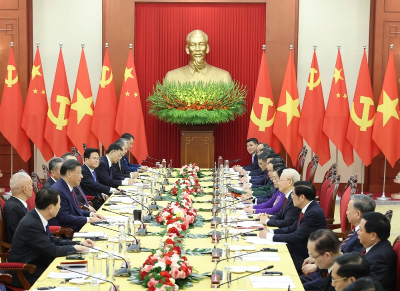 当地时间12月12日下午,刚刚抵达河内的中共中央总书记、国家主席习近平在越共中央驻地同越共中央总书记阮富仲举行会谈。这是阮富仲在主席府广场为习近平举行隆重欢迎仪式。新华社记者 鞠鹏 摄 新华社河内12月12日电(记者倪四义 汪金福 陶军)当地时间12月12日下午,刚刚抵达河内的中共中央总书记、国家主席习近平在越共中央驻地同越共中央总书记阮富仲举行会谈。双方宣布中越两党两国关系新定位,在深化中越全面战略合作伙伴关系基础上,携手构建具有战略意义的中越命运共同体。 当地时间12月12日下午,刚刚抵达河内的中共中央总书记、国家主席习近平在越共中央驻地同越共中央总书记阮富仲举行会谈。新华社记者 庞兴雷 摄 主席府广场庄严热烈,金星红旗同五星红旗相映成辉,数百名欢迎儿童绽放的笑容灿烂明媚。 阮富仲为习近平举行隆重欢迎仪式。 当地时间12月12日下午,刚刚抵达河内的中共中央总书记、国家主席习近平在越共中央驻地同越共中央总书记阮富仲举行会谈。这是阮富仲在主席府广场为习近平举行隆重欢迎仪式。新华社记者 鞠鹏 摄 习近平和夫人彭丽媛乘车抵达时,阮富仲夫妇在下车处热情迎接,越南少年儿童向习近平夫妇敬礼献花。两党总书记同双方陪同人员分别握手致意。习近平同阮富仲登上检阅台。军乐队奏中越两国国歌,鸣21响礼炮。习近平在阮富仲陪同下检阅仪仗队并观看分列式。 当地时间12月12日下午,刚刚抵达河内的中共中央总书记、国家主席习近平在越共中央驻地同越共中央总书记阮富仲举行会谈。这是阮富仲在主席府广场为习近平举行隆重欢迎仪式。新华社记者 殷博古 摄 当地时间12月12日下午,刚刚抵达河内的中共中央总书记、国家主席习近平在越共中央驻地同越共中央总书记阮富仲举行会谈。这是阮富仲在主席府广场为习近平举行隆重欢迎仪式。新华社记者 鞠鹏 摄 当地时间12月12日下午,刚刚抵达河内的中共中央总书记、国家主席习近平在越共中央驻地同越共中央总书记阮富仲举行会谈。这是阮富仲在主席府广场为习近平举行隆重欢迎仪式。新华社记者 鞠鹏 摄 欢迎仪式后,习近平和阮富仲乘车前往越共中央驻地。当地各界群众挥舞两国国旗夹道欢迎,沿途洋溢着热烈友好的氛围。 当地时间12月12日下午,刚刚抵达河内的中共中央总书记、国家主席习近平在越共中央驻地同越共中央总书记阮富仲举行会谈。新华社记者 庞兴雷 摄 当地时间12月12日下午,刚刚抵达河内的中共中央总书记、国家主席习近平在越共中央驻地同越共中央总书记阮富仲举行会谈。新华社记者 申宏 摄 习近平同阮富仲举行会谈。 习近平指出,很高兴如约而至,完成同阮富仲总书记的第三轮互访。作为同志加兄弟,我们为越南革新开放近40年特别是越共十三大以来取得的发展成就感到由衷高兴。中方坚定支持越南继续推进社会主义建设事业,相信在以阮富仲总书记同志为首的越共中央坚强领导下,越南党和政府一定能顺利完成越共十三大提出的各项任务,为实现越南建党建国“两个一百年”奋斗目标奠定坚实基础。 习近平强调,中越两国在各自争取国家独立和民族解放斗争中相互支持,在彼此改革开放和革新事业中互学互鉴,“越中情谊深、同志加兄弟”是中越关系最生动写照。中方始终从战略高度和长远角度看待中越关系。当前,世界之变、时代之变、历史之变正以前所未有的方式展开。中越两党作为世界前两大执政的共产党,都坚持和发展马克思主义,都坚定不移走社会主义道路,都在领导各自国家进行社会主义建设,更应该从壮大世界社会主义力量和确保各自社会主义建设事业行稳致远的高度,把握中越关系的特殊战略意义,扎实推进中越命运共同体建设。相信在双方共同努力下,中越关系将进入政治互信更高、安全合作更实、互利合作更深、民意基础更牢、多边协调配合更紧、分歧管控解决更好的新阶段,中越两国社会主义建设事业将不断取得新成就,并为地区乃至世界稳定、发展、繁荣作出新贡献。 习近平就构建中越命运共同体提出几点建议。 政治上,要把准方向。要坚持高层战略引领,加强治党治国经验交流互鉴,共同深化对共产党执政规律、社会主义建设规律、人类社会发展规律的认识。在涉及彼此核心利益和重大关切问题上坚定相互支持,共同维护国际公平正义。 安全上,要深化互信。要把维护国家政治安全放在首位,确保社会主义红旗颜色不变,全力防范、化解、遏制各类政治安全风险。中方坚定支持越南维护社会安定和民族团结,相信越方将继续支持中国反对外部干涉、坚定推进国家统一大业。 务实合作上,要提质升级。14亿多中国人民整体迈向现代化是中国带给世界的巨大机遇,中方愿同越南同志分享机遇、共谋发展。欢迎越方积极对接高质量共建“一带一路”的八项行动,拓展数字经济、绿色发展等新兴领域合作。双方要共同实施好《区域全面经济伙伴关系协定》,维护全球自由贸易体系,构筑安全稳定、畅通高效、开放包容、互利共赢的全球产业链供应链。中方将继续鼓励有实力的中国企业赴越南投资兴业,希望越方为中国企业提供良好营商环境。 民意基础上,要加大投入。中越合作要多向农业、教育、医疗等民生领域倾斜,加强青年、旅游、地方等领域合作,增加两国民众对中