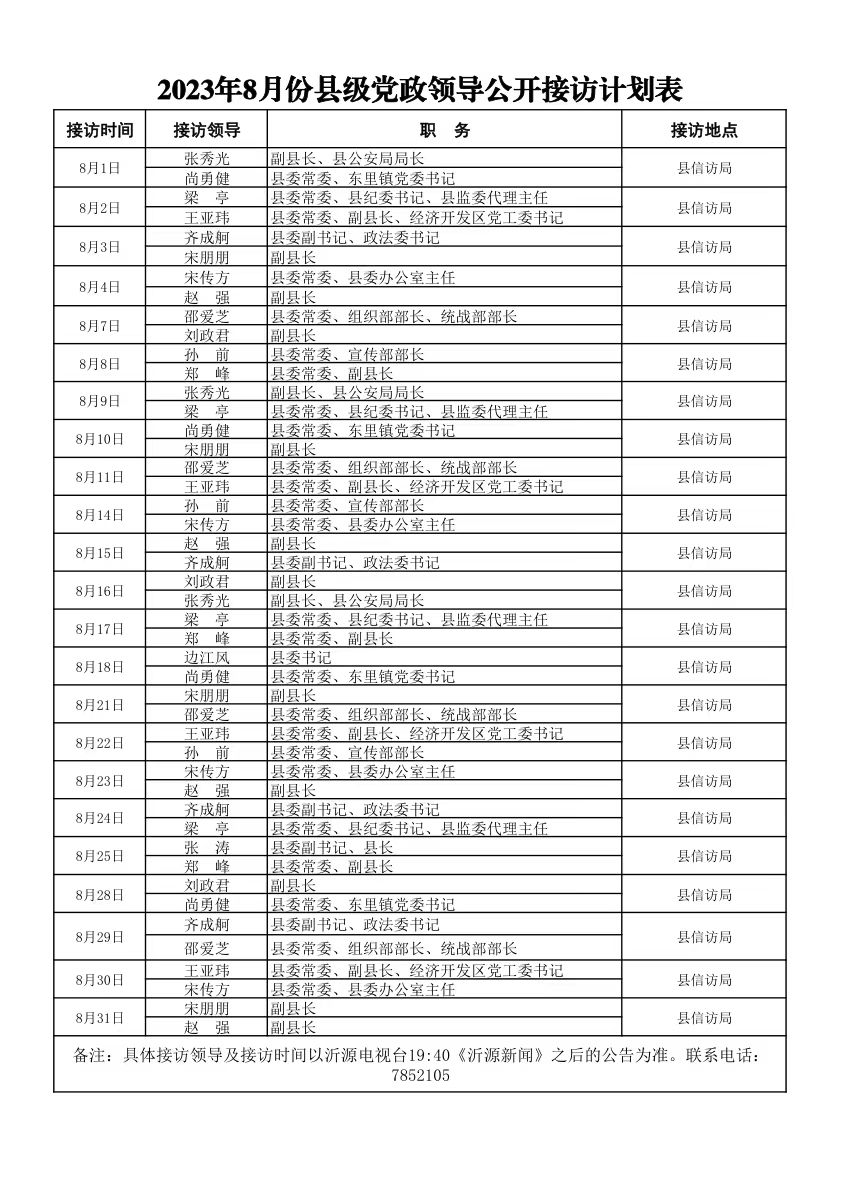 2023年8月份县级党政领导公开接访计划表