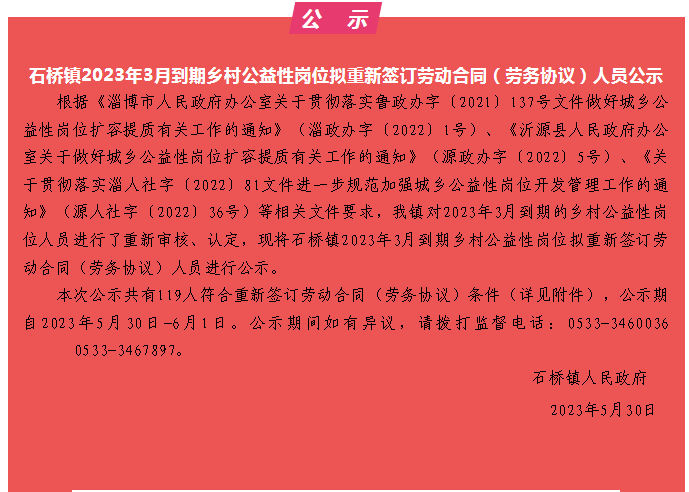 公益性岗位是政府就业援助体系的完善,是群众就业途径的拓宽,是保障民生和社会稳定的途径,更需要依托政务公开促工作公开透明,全方位接受群众监督。 一是加强组织领导,夯实工作基础。强化公益性岗位招聘、考核等全流程公开,推动政策知晓度和受惠面不断扩大,为就业困难者提供精准就业服务。 二是拓展公开方式,强化工作重点。沂源县石桥镇通过线上“党建引领 红色石桥”微信公众号以及线下三务公开栏同步公示方式,对石桥镇2023年3月到期乡村公益性岗位拟重新签订劳动合同(劳务协议)人员进行公示。公示内容涵盖政策依据,公示期,监督电话,拟聘人员姓名、身份证号、人员类别、岗位名称等信息,力求信息详实,彰显公正公平,让工作流程公开、透明,有效保障群众对于公益性岗位责任部门的监督权。 三是深化思想赋能,精准责任担当。认真落实各级“稳就业、保就业”工作要求,围绕促就业助增收攻坚行动,科学精准谋划,统筹协调推进,切实把“城乡公益性岗位扩容提质行动”这项重要民生工程做细做实,利用公益岗位提供更多就近就地就业机会,筑牢民生之本,稳住财富之源,助力乡村振兴。 下一步,沂源县石桥镇将一方面聚力工业发展,积极通过“留守就业绿色通道”等方式解决村民“打工难”的问题;另一面继续重视政务公开工作,将其视为国家政策扩音器,政群关系连心桥,以公开促公平,以服务促发展,确保实现社会安定、产业兴盛、居民增收。 | |||