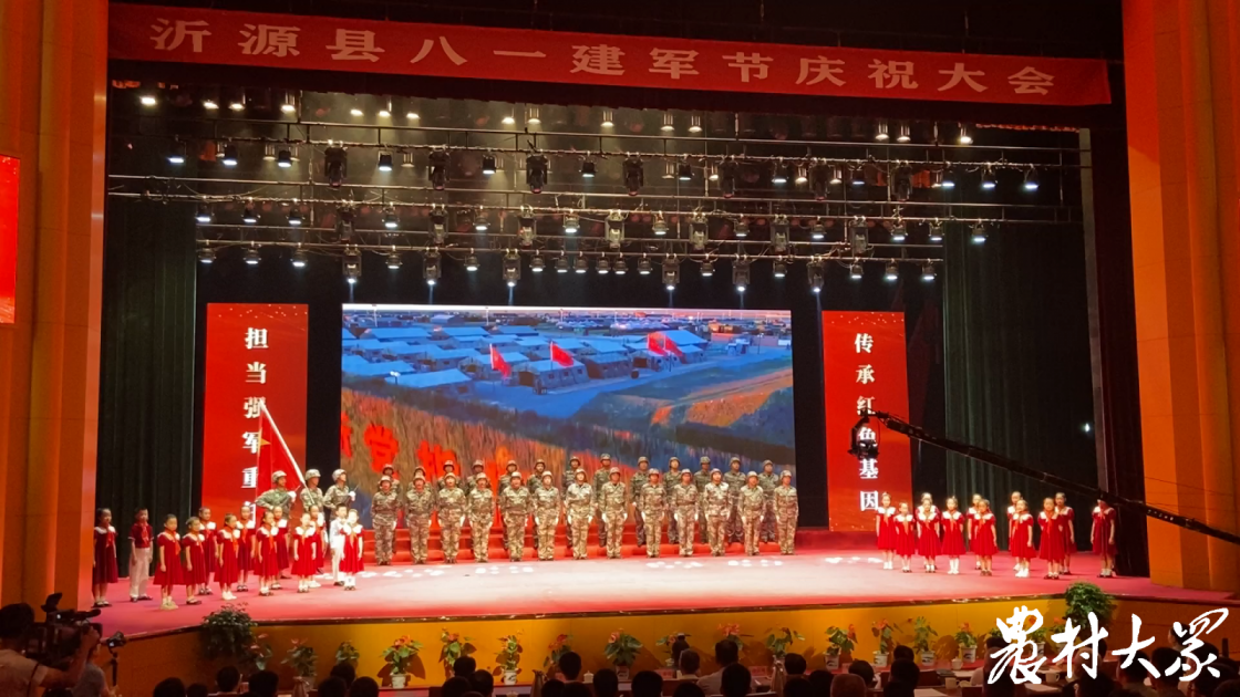 舞台上,兵妈妈去部队看望战士们。 今年的沂源县“八一”建军节庆祝大会隆重又特别。 7月31日下午,沂源县人民会堂里,与大会隆重表彰2023年沂源县新时代好军嫂、兵妈妈,最美拥军单位、拥军人物,最美退役军人等仪式穿插进行的,是一场名为“一声到 一生到”的感人至深的拥军情景剧。 情景剧以男主角向国强参军入伍,在部队立功家里收到立功喜报,家人默默担负家庭责任,再到他退役返乡创业,投身乡村振兴期间多个感人的小故事为主线;以沂源兵妈妈服务站的兵妈妈们去部队拥军,县内涌现大量拥军门店、拥军单位,政府为驻地部队排忧解难等真实事迹为副线;通过11名现役军人、37名退役军人、3名兵妈妈、4名军嫂及8名县退役军人事务局工作人员等100多位业余演员们倾情演出,将现场的观众们深深打动;浓浓的拥军情、深深的爱民意,在这里融合升华。 台上,向国强的妈妈和多位兵妈妈过年时一起去部队看望战士们,看着眼前和自己儿子一般年龄的战士,她说:“他(向国强)执行任务音信全无的时候,我是每天悬着心,吃不好睡不着……看着你们,就想起了我的儿子……”