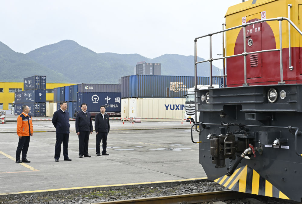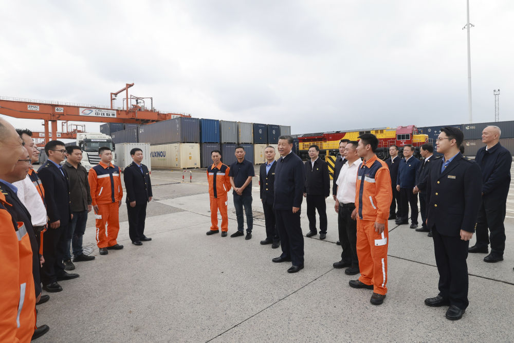 4月22日至24日,中共中央总书记、国家主席、中央军委主席习近平在重庆考察。这是22日下午,习近平在重庆国际物流枢纽园区重庆铁路集装箱中心站考察。新华社记者 岳月伟 摄