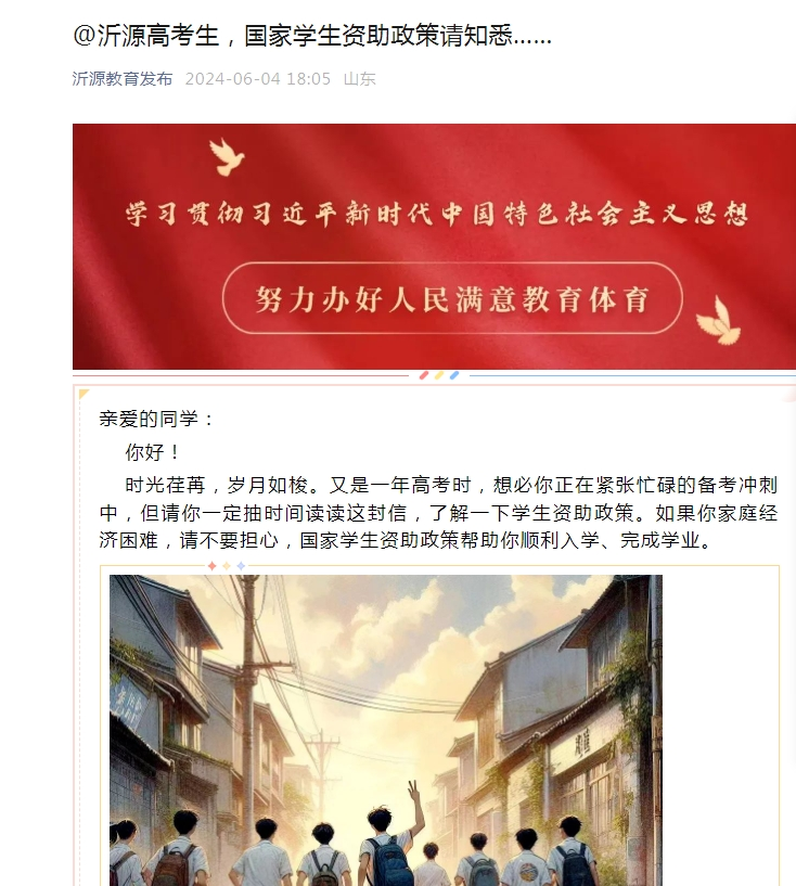 持将五色笔,夺取锦标名。一年一度的中高考如约而至,为确保广大考生有一个良好的学习、生活和考试环境,县教育和体育局以政务公开为依托,充分动员协调各方资源力量,推出多项举措,全力为中高考保驾护航。 一是营造浓厚氛围。线上在“沂源教育发布”公众号发布《致2024年夏季高考考生及家长的一封信》《@沂源高考生,国家学生资助政策请知悉……》《沂源县中高考24小时“守望”心理援助热线已上线!》等相关文章并组织通讯员转发到班级群、家长群,实现考生、家长全覆盖、全知晓。线下召开考生大会、家长会,全面普及有关考试的法律法规要求,使考生从思想上提高认识,敬畏法纪,端正心态从容应考,疏解考生的焦虑情绪,为考生营造安静祥和的备考氛围。