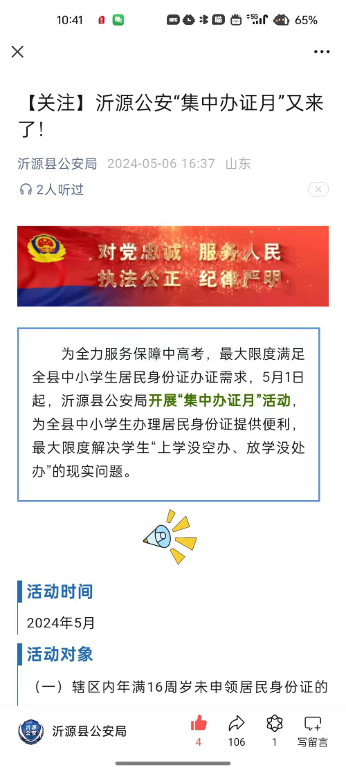 沂源县公安局以政务公开为抓手,强化部署、多措并举,积极向社会发布权威信息,助力考试安全平稳顺利,全力打造“阳光考试”“平安考试”,为莘莘学子保驾护航。 一是积极开展办证月活动。5月1日以来,全县户籍窗口开通预约办、延时办、上门办等服务举措,主动对接辖区学校,开启周末不打烊,午间不休息工作模式,通过发放“明白纸”“办证指南”及新媒体宣传等方式,提高“集中办证月”活动知晓度,全心全力为考生办理身份证件。 二是畅通在线预约服务。通过新媒体和办公场所公布等方式,向社会广泛公布户籍窗口咨询、预约电话,接受个人预约和学校集体,随时为考生办证提供最大便利。 三是集中展开宣传。在沂源一中考点显眼位置统一标准设立“户籍窗口服务站”,利用“沂源县公安局”公众号、家长微信群,提前告知广大家长和考生“户籍窗口服务站”站点设置地点、功能、联系电话等服务信息,为丢失或忘记携带身份证的考生现场办理《临时身份证明》,刷脸秒办、立等可取,并提供准考证打印、身份证挂失招领、户籍业务咨询等服务,确保考试工作的顺利开展。 | |||