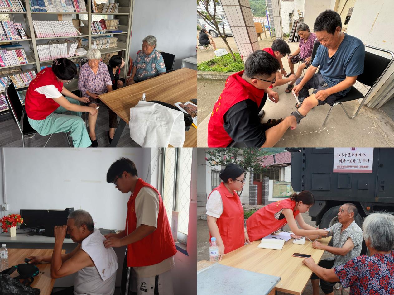 健康有我 中医先行 “岐黄国医”志愿服务队成员们到达沂源县中庄镇富家村,与村委会领导进行沟通交流,在村委会成员的帮助下,队员们了解到富家村的基本情况:村民人员构成、村民基础病史、村卫生室医诊等,初步拟定实践提纲、确定实践计划。 活动开始之前,团队成员通过调查了解到当地长期居住的村民普遍在60岁以上且文化程度不高,为方便交流沟通,队员们决定以问答的形式来进行病情诊断。7月22日,“岐黄国医”志愿服务队成员们在董康、赵晓君、李宁老师的带领下,开始进行爱心医疗服务活动,本次活动开展健康咨询、测血压、推拿、刮痧、艾灸等中医特色服务,得到了村民们的一致好评。
