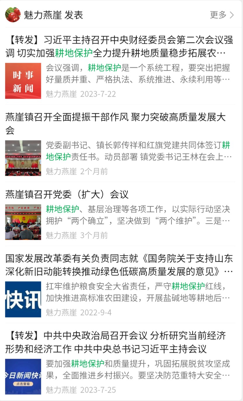 为切实加强耕地保护工作,提高辖区群众耕地保护意识,沂源县燕崖镇将政务公开作为推动耕地保护工作的强力抓手,紧密结合本镇工作实际,将政务公开贯穿至整个耕地保护工作中,不断夯实粮食安全生产的坚实基础。 一是公开宣传营造自觉保护耕地氛围。将耕地保护的相关政策进行“精细化”解读。扎实做好耕地保护政策宣传解读工作,利用横幅标语、科普手册、魅力燕崖公众号、宣传车等多种方式进行耕地保护知识宣传。累计悬挂横幅60余条,发放明白纸2000余份,出动宣传车5次,并对土地资源保护利用、高标准农田建设、卫片执法等政策文件进行详细解读,引导群众树立耕地保护理念,切实增强依法依规用地意识。 (魅力燕崖公众号积极发布耕地保护相关政策) 二是积极落实责任机制确保源头管控。实行“乡包村、村包组”,强化源头管控,分管负责人、包村干部、各村负责人密切配合,让每一块耕地都有守护人,形成分工负责、齐抓共管的耕地保护长效机制,实现对耕地和永久基本农田的全方位、全覆盖、无缝隙管理。同时对群众反映的涉及耕地问题形成台账,分管负责人及包村干部务必调查解决好,解释好,管理好,防止出现因群众不了解政策而导致的矛盾纠纷。