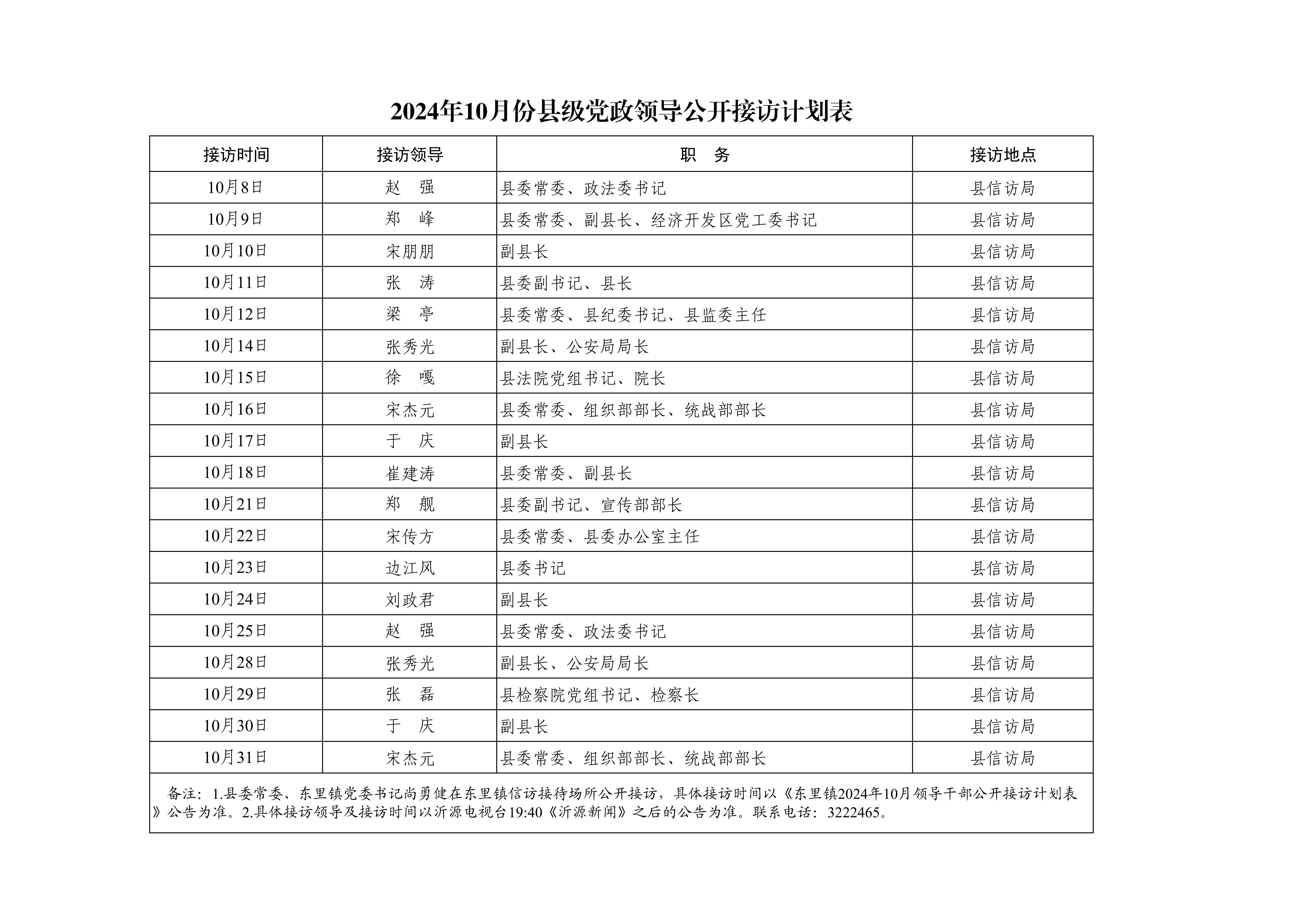 2024年10月份县级党政领导公开接访计划表
