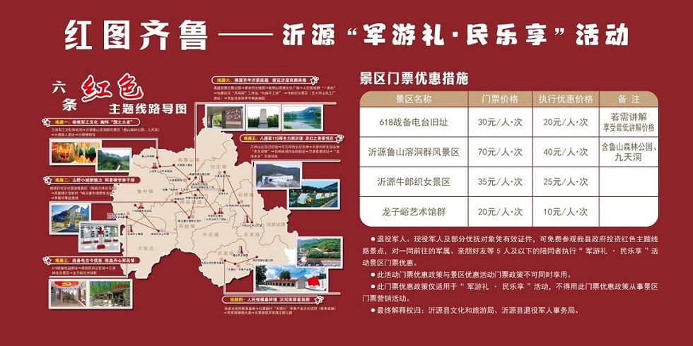 按照山东省退役军人事务厅相关部署要求,自2024年4月份开始,沂源县退役军人事务局、县财政局、县商务局、县文化和旅游局联合发布“军游礼·民乐享”活动红色主题线路及具体优惠措施。2025年以此为依托,在进一步梳理优化主题线路的基础上,深入实施“红图齐鲁·沂润心田”工程,加快以革命传统传承、红色文化铸魂、场景融情入心为主的多模式、多元化场景供给,打造退役军人“思政教育+文旅”新IP。 沂源“军游礼·民乐享”六条红色主题旅游线路 线路一:体味军工文化 胸怀“国之大者” 巍巍鲁山,滔滔沂河。在上世纪六十年代“备战备荒为人民”时期,鲁中腹地众多三线军工企业大多聚集于鲁山风景区内。一大批有着“献了青春献终身、献了终身献子孙”报国志向的技术人才远离都市走进大山深处发展军工生产,后来部分军工企业的技术、工人和生产线转入地方,成为沂源工业的基石。在这里长大的“军娃娃”,半个多世纪以来陆续从四面八方归窠回巢相聚,一同追寻红色辉煌印记。方圆百里之内探秘“齐鲁先民”沂源猿人文化。 路线:976军工记忆体验馆→沂源鲁山溶洞群风景区(鲁山森林公园、九天洞)→沂源猿人遗址→沂源博物馆 沂源地处淄博、泰安、济南、临沂、潍坊五市的结合部,集乡村慢生活、山野美食、休闲娱乐、科技体验于一体,在这里吃的是绿色食材,品的是农家美味,享的是山里好客,领着孩子走进大山的同时,体味老区不老风华正茂、迷人小城现代魅力。观摩教育系统劳动模范“坚守沂蒙山区70年、百万捐款诠释人间大爱”的事迹展馆。 路线:锦绣许村乡村旅游度假区→燕崖镇计宝峪村“峪见童年理想生活村”→李振华事迹展馆 国防动员,平战结合。沂蒙山区乃军之要塞、兵家必争之地。为响应中央军委“一旦发生战事,党和人民的声音不中断”的号召,七十年代末由时任济南军区司令员杨得志将军亲自选址六一八战备电台,建成后覆盖淄博、临沂、潍坊、泰安等13个市县。从地下坑道体验、军事电台设施布局到24个展室介绍,完美呈现出华东地区规模最大、保存最完整的战备电台原貌。沿着红色线路南行,游览抗日战争时期“六次大捷”的南岩民兵英雄队纪念馆,聆听南岩民兵队长刘建军“山东省特级民兵英雄和模范民兵指挥员”,熊家忠、熊子明等“民兵战斗英雄”的光荣事迹。走近大张庄镇双山村“省十佳兵妈妈”刘华,讲述儿子戍边守疆的事迹。同期观赏“艺术活化乡村”的魅力和乡村振兴样板村。 路线:618战备电台旧址旅游区→南岩民兵英雄队纪念馆→汇泉桃花岛景区→龙子峪艺术馆群 线路四:人民楷模桑梓情 沂河两岸看双拥 山东唯一“人民楷模”朱彦夫,放弃荣军修养待遇回到家乡,以自强不息的精神带领群众共同富裕,被称为山东“兵支书”的鼻祖。从朱彦夫旧居、夜校旧址、龙王庙大口井、友谊机灌站、大寨田、棚沟造地、红山梯田等13个教学点中感受顽强拼搏、不懈奋斗的光辉历程,踏寻人民楷模的生命奇迹。沿着楷模大道,游览沂河双拥主题公园,感悟沂源第一个党支部点燃“星星之火”的红色伟力。 路线:朱彦夫党性教育基地→红源新村“沂源红”苹果产业文化项目(秋季采摘)→楷模大道→东里镇滨河双拥主题公园 按照毛主席“派兵到山东区”的指示,八路军115师“英雄连长”何万祥,从1931年甘肃宁县参军到山东沂源战斗中牺牲于石桥镇老虎山,一直辗转在战场第一线,是公认的115师开路先锋、日伪军堡垒的克星,是国家民政部公布的首批著名抗日英烈。何万祥英雄连保留至今。万祥山记忆馆、银杏树下的兵工厂、徐向前茶峪村住所、石桥伏击战......等一串串红色印记,彰显着“红色石桥”的底蕴。沿着博沂路西行,在悦庄镇北张良村领略沂源县委旧址,回首沂源县党组织领导人民、团结人员走过的烽火岁月,这里体现沂源“赤红之美”的主旨要义。 路线:万祥山红色记忆馆→何万祥烈士纪念碑→大泉村民生综合体“老兵讲堂”→石桥南涧伏击战旧址→沂源县委原旧址→“龙湾水乡”文旅项目 沂河是沂蒙山区的母亲河,纵横千里,九曲婉转,蕴含着红色底蕴,流淌着红色基因。80年沧桑巨变,老区风华正茂,一座座双拥新地标拔地而起,新南麻战役纪念馆正在筹建施工。双拥主题公园、双拥文化广场、革命烈士陵园、怡康社区“兵妈妈”工作站,成为一道道亮丽的双拥风景线。领略国内唯一在天成象、在地成形的牛郎织女爱情文化。 路线:簴盛双拥主题公园→革命烈士陵园→胜利山双拥文化广场→人民路双拥“一条街”→怡康社区“兵妈妈”工作站“勾编手工坊” →牛郎织女景区(含大贤山兵工厂遗址)→燕崖双泉秋季苹果采摘园 | |||