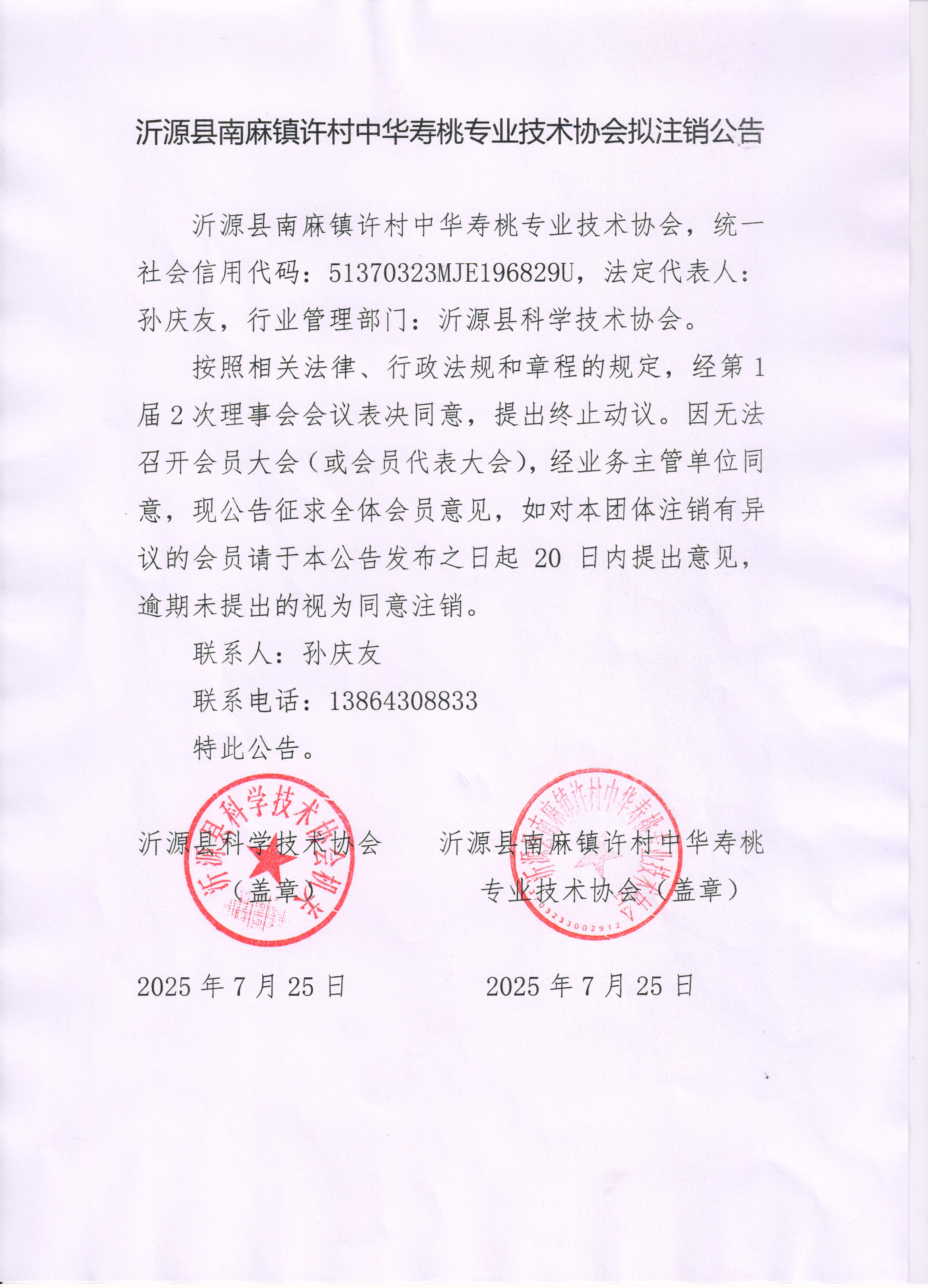 沂源县南麻镇许村中华寿桃专业技术协会拟注销公告