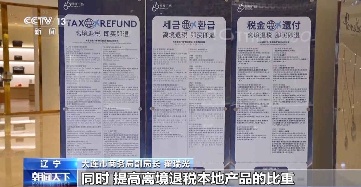 今年以来,随着我国单方面免签“朋友圈”扩容至47个国家,境外旅客规模不断扩大,“中国游”也带火了“中国购”。 从本月起,离境退税政策实施地新增大连市和湖北省。随着政策实施向更多地区延伸,为进一步扩大入境消费提供有力支撑。 在大连的一家商场内,来自俄罗斯的游客塔吉娅娜正在品茶,她想买一些茶叶带回俄罗斯送给家人和朋友。 这家商场刚刚启动了离境退税业务,外国游客购物后可以到商场内的“即买即退”集中退付点办理退税手续,现场就能拿到退税现金。 俄罗斯游客 塔吉娅娜:刚才我们品尝了中国的茶叶,非常喜欢,正好赶上了退税的优惠政策,我们感到很幸运。 按照当地的政策,境外旅客取得购物发票并在《离境退税申请单》上签字后,用手机扫描“即买即退”二维码,上传身份证件、退税申请单、发票,录入信用卡信息,并签署知情同意事项后,就可以获得退税款。不少外国游客拿到退税现金后准备继续“买买买”。 俄罗斯游客 玛丽娜:我们想把省下来的钱买一些海参。 目前,大连市共有5家综合商场、40多个品牌商户开展离境退税业务。下一步,相关部门将进一步优化退税商店的布局,提升境外旅客的消费体验。 大连市商务局副局长 翟瑞光:在大型的商圈、步行街、旅游景区、酒店等境外旅客集聚地增设退税商店,为境外的游客提供更多更好的即买即退消费场景。同时,提高离境退税本地产品的比重,我们将对全市国货潮品、老字号、文创等商品进行全面梳理,择优选入退税商店,让更多境外游客有大连好物可选。 同样,湖北也在这两天启用了全省首批57户离境退税商店,覆盖武汉、宜昌、恩施、黄冈等8个市州,进一步便利外国游客“购”湖北。 波兰游客 维娜:我不仅买了电子产品,还买了一些衣服和手工艺品。我想离境退税政策会吸引更多外国顾客购买中国商品。 数据显示,今年上半年,共有160多个国家和地区的外籍旅客从武汉口岸入境,人次同比增长30.31%,总消费同比增长37.84%。随着离境退税政策在湖北落地实施,入境消费将进一步扩大。 优化退税政策 入境游流量变消费增量 在各项政策利好的带动下,多地离境退税业务保持高增长势头。为了让旅游流量更好地转化为消费增量,各地也在进一步增加退税商店数量、丰富退税商品供给、优化退税办理流程。 近日,上海创新打造“即买即退+便捷支付”场景,支持境外旅客使用电子支付办理退税。 在黄浦区的一个商圈内,来自印度尼西亚的游客哈迪亚万购买化妆品后,在“即买即退”集中退付点使用“碰一下”功能,退税款即刻就打到了他的支付宝账户。 印度尼西亚游客 哈迪亚万:退税款可以很便捷地回到我们的账户,这是一种很棒的方式,完全不用使用任何现金。 目前,上海黄浦区的各大重点商圈已开设了6个“即买即退”集中退付点,并率先推出了电子退付方式,让外国游客体验“即买即退、资金秒达”的瞬时退税服务。 韩国游客:这种方式真的很方便,让我们更容易拿到退税款。 眼下,上海正在持续扩大入境消费,推出夜生活节、国际邮轮节等特色活动,并与苏浙皖共签入境游一体化发展合作协议,力争实现2025—2027年长三角入境过夜游客年均增长10%。而从“上海游”到“上海购”,上海的离境退税服务也在升级完善。 上海市商务委员会副主任 刘敏:我们出台本市优化离境退税服务的行动方案,在上海的重点商圈,力争离境退税服务的商店基本全覆盖。同时,还要拓展到文博场馆、旅游景点、酒店、文化场所、体育赛场,都要增设离境退税服务的商店。 作为境外旅客“中国购”的“心头好”,国产手机、智能手表、无人机等产品的销量持续增长。深圳的华强北最近新增了一批离境退税商店,智感满满的科技产品备受外国人青睐。 加拿大游客 艾利克斯:我想入手一个超广角镜头,可能还想配个滤镜。我知道会有一部分退税款,这确实会刺激我多买一些。 为了进一步发挥口岸资源优势,近日,深圳新增设了2个离境退税口岸,已开通的离境退税口岸已达5个,成为全国离境退税口岸数量最多的城市,满足外国游客就近办理离境退税的需求。 接下来,深圳将在全市推广“一单一包”便利化模式,创新“预审快退”“扫码即退”“电子退付”等数字化退税服务,不断提升外国游客的通关效率和退税体验。 深圳市商务局市场建设处三级调研员 邱敏钊:政策的红利直接推动了业务量的爆发式增长,电子品类产品的销售表现尤为突出。今年上半年,深圳退税业务延续强劲增长态势,退税商品销售额、办理业务量分别同比增长2倍和4.3倍。 文创“圈粉” 激发入境消费新活力 随着免签政策红利不断释放,境外旅客消费热情持续高涨。今年暑期,四川各地的博物馆外籍游客数量明显增加。“文博”热的同时,文创产品也在激发入境消费新活力。 三星堆盲盒、神鸟冰箱贴、面具咖啡杯、袖珍款青铜神树,在四川广汉市三星堆博物新馆的离境退税商店内,上百款以三星堆文物为设计原型的文创产品实力“圈粉”老外,外国游客在这里“买买买”不停。 美国游客 乔丹:这些纪念品看起来很酷,我们觉得特别有意思的一样东西,就是那个青铜神树冰箱贴。看到这些文创产品能让人想起这次旅行,这本身就很有意思。 美国游客 特雷:各种各样的黄金制品文创,太酷了,非常独特,它们看起来和馆内展出的文物一模一