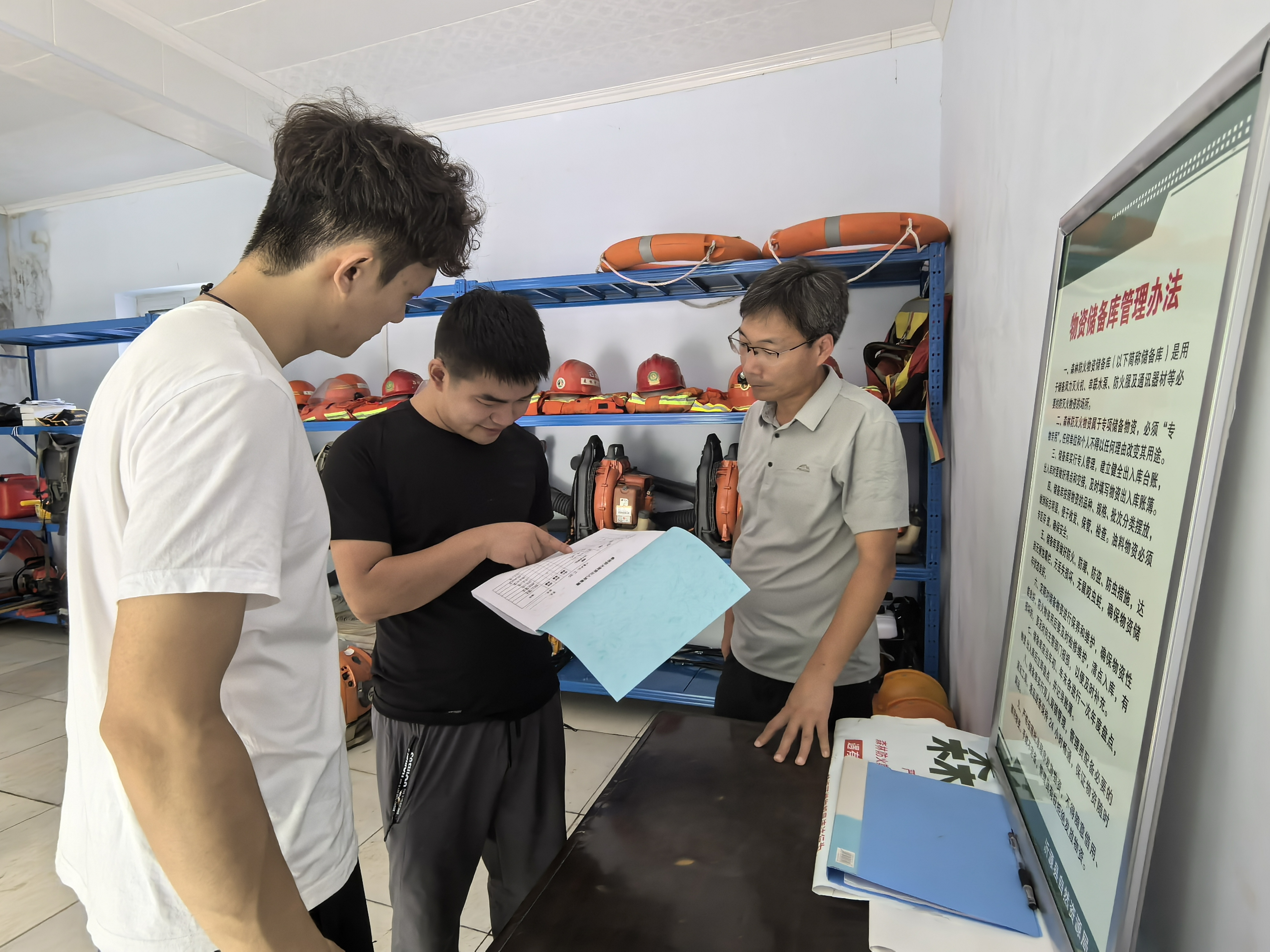 近日,沂源县审计局在县自然资源资产管理及资金绩效情况专项审计调查中,重点关注森林防火物资管理使用情况,通过实地盘点物资、核对库存台账、查看仓库存储条件等方式,核查风力灭火机、防火服等物资质量及分类存放等仓储规范化程度,检查物资出入库记录是否及时准确,督促相关主管部门加强森林防火物资管理及质量控制,助力森林防火工作顺利开展。图为审计人员实地查看林场防火物资储备管理情况。