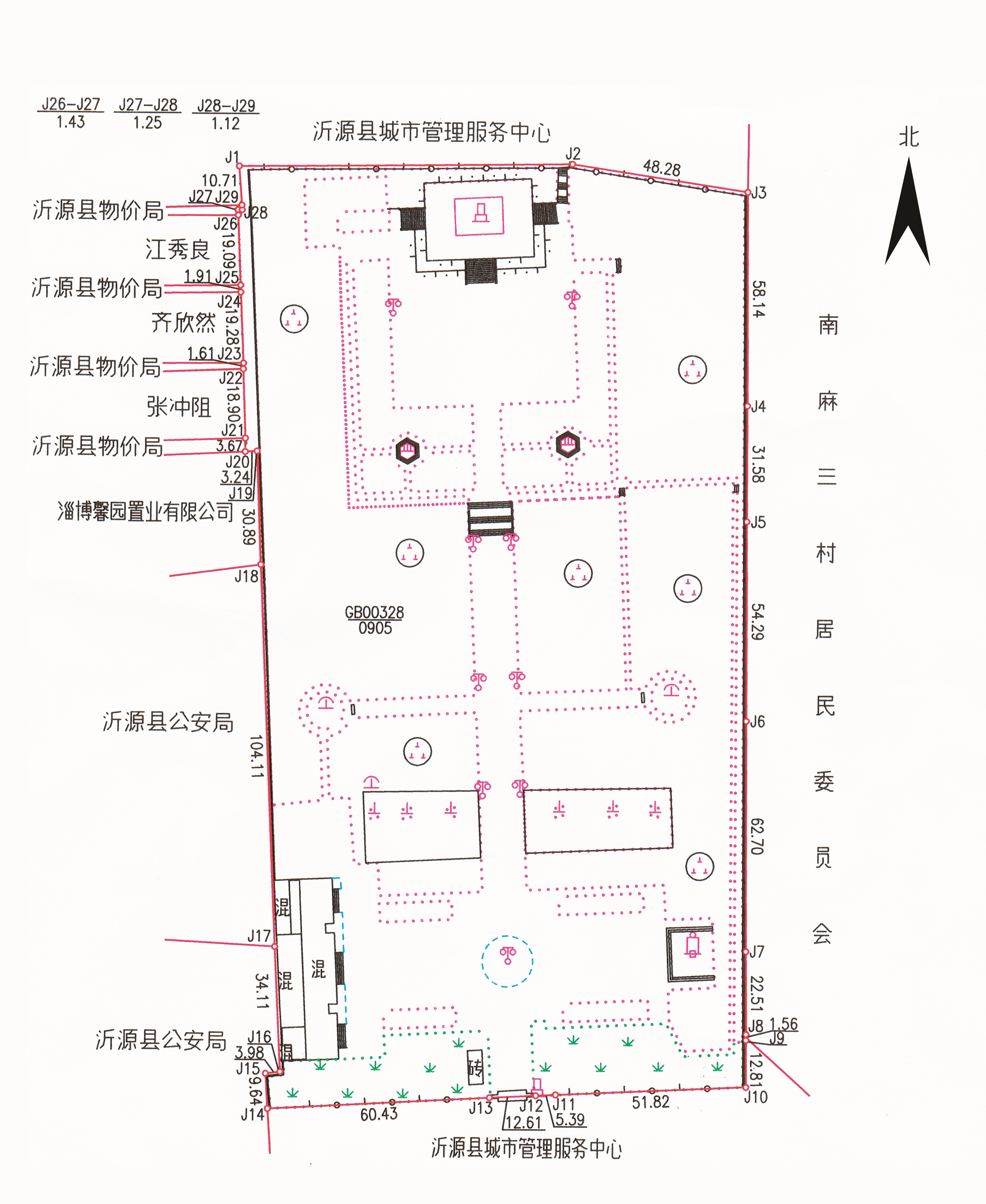 沂源县革命烈士陵园保护范围:陵园占地面积为33421.59平方米,保护范围为宗地图所示红线内的区域,东侧以J3-J10连线为界;南侧以J10-J14连线为界;西侧以J1-J14连线为界;北侧以J1-J3连线为界。