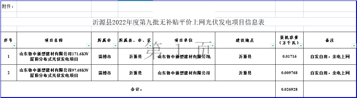 附 件:沂源县2022年度第九批无补贴平价上网光伏发电项目信息表