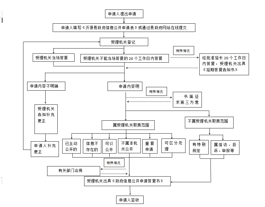 办机关办理申请人政府信息公开申请时,能够当场答复的,将当场答复;不能当场答复的,自收到申请之日起20个工作日内予以答复;确需延长答复期限的,延长答复时间不超过20个工作日,并告知申请人。政府信息涉及第三方权益的,应当征求第三方的意见,征求第三方意见所需时间不计算在期限内。