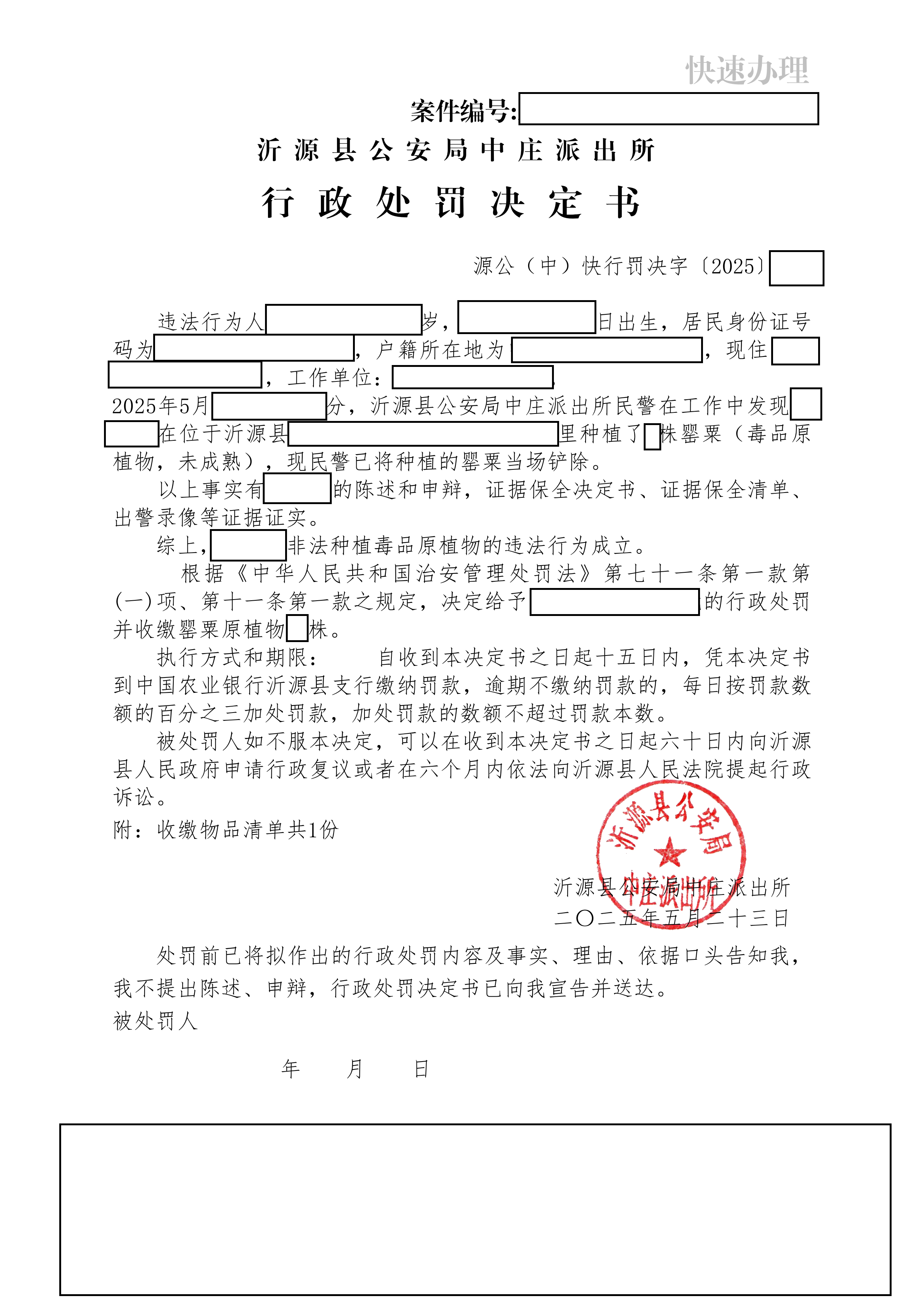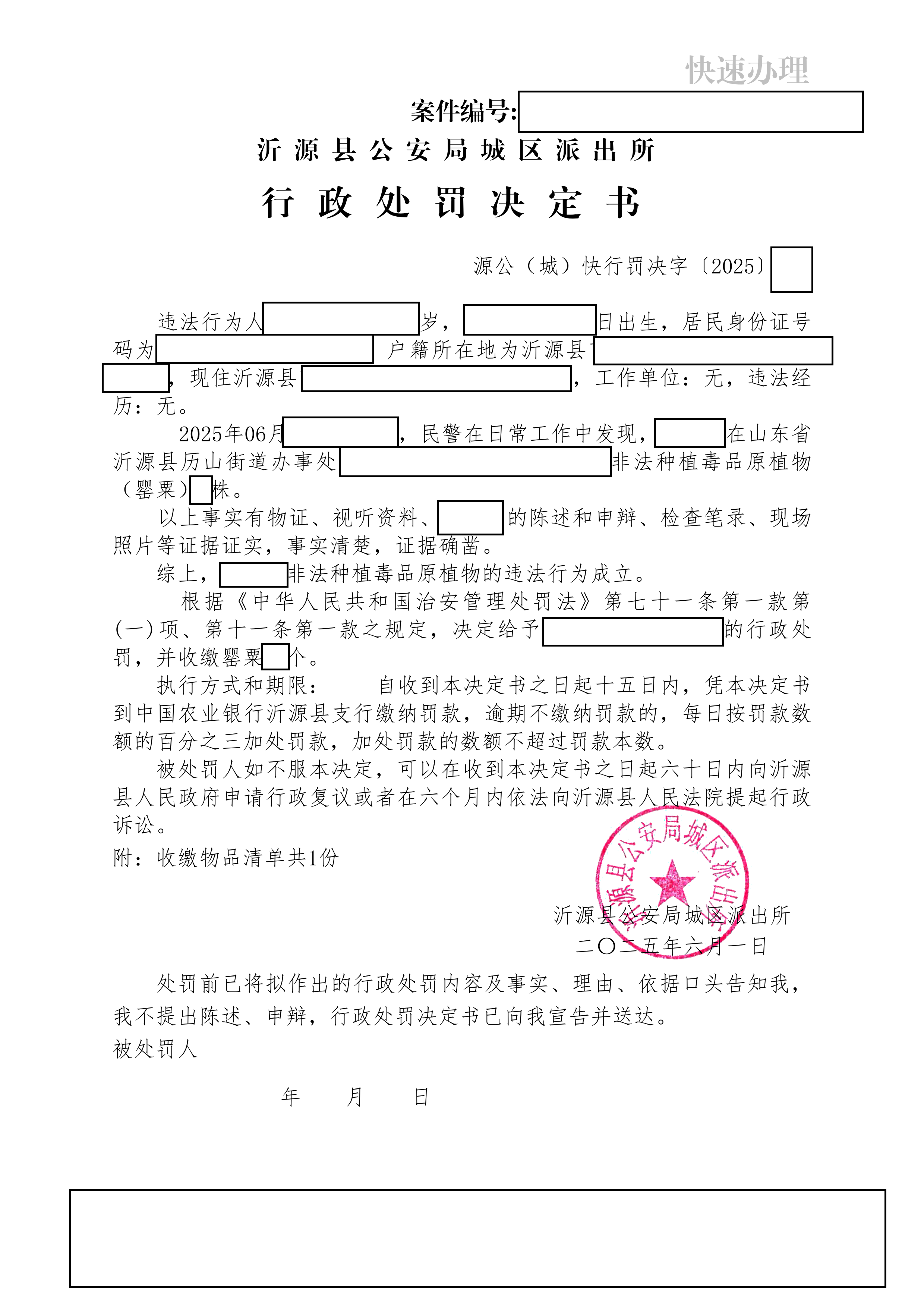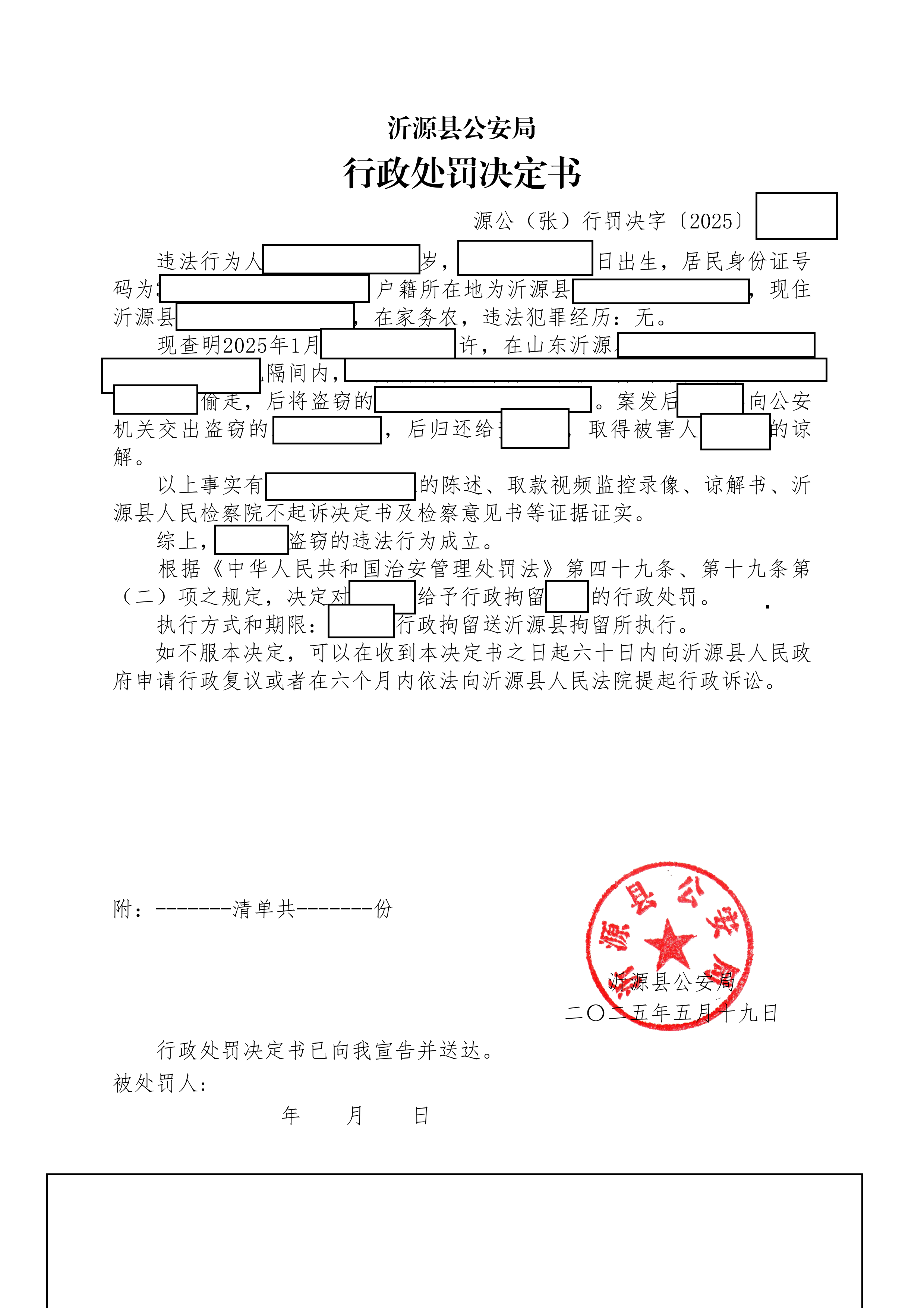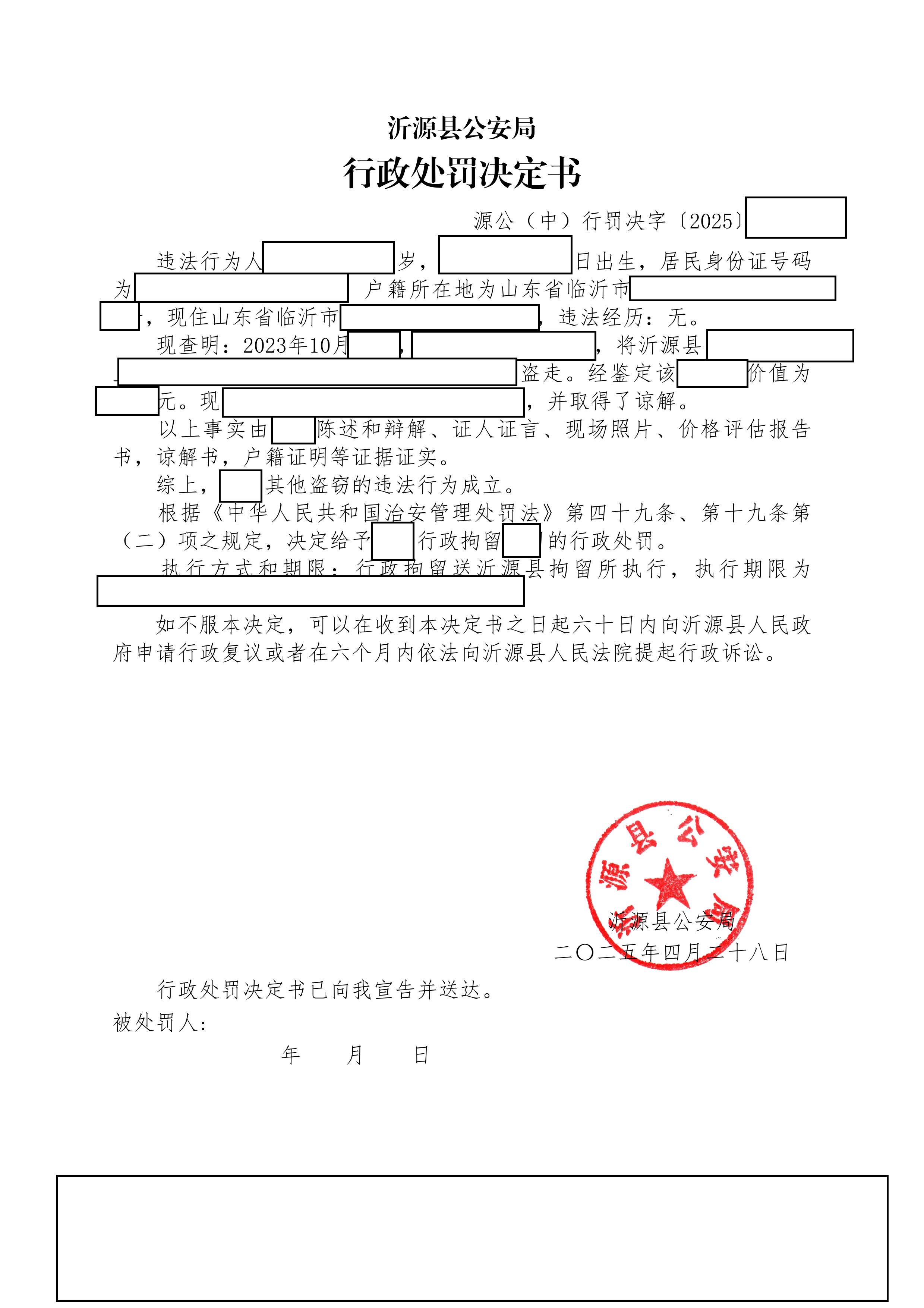 沂源县公安局2025年二季度行政处罚决定书