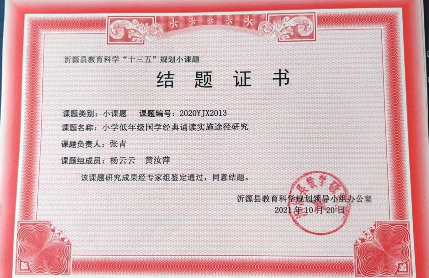 沂源县历山街道办事处荆山路小学张青小课题结题证书