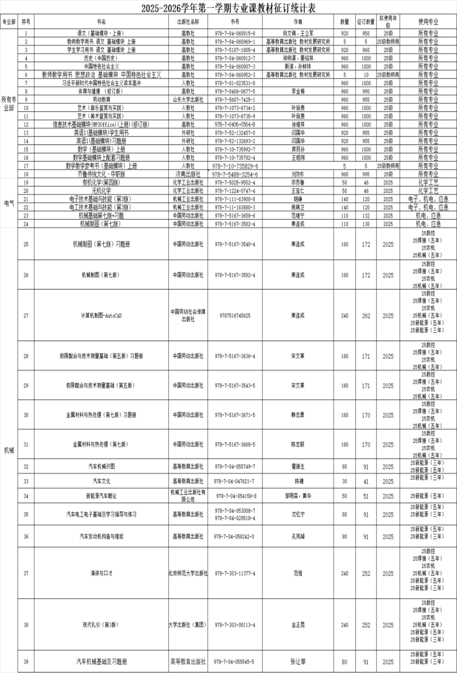 淄博电子工程学校2025年秋季学期教材、教辅征订明细