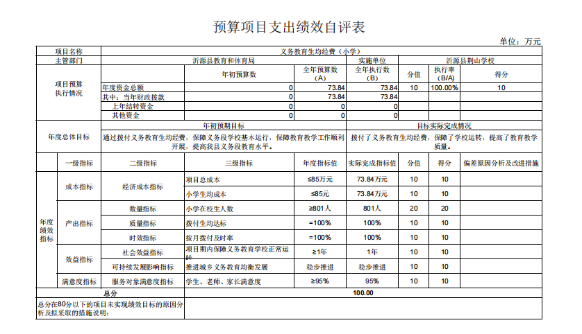 2.“109567沂源县荆山学校_项目义务教育生均经费(小学)”项目绩效自评综述:根据年初设定的绩效目标,项目自评得分为100分。全年预算数为73.84万元,执行数为73.84万元,完成预算的100%。项目绩效目标完成情况:拨付了义务教育生均经费,保障了学校运转,提高了教育教学质量。