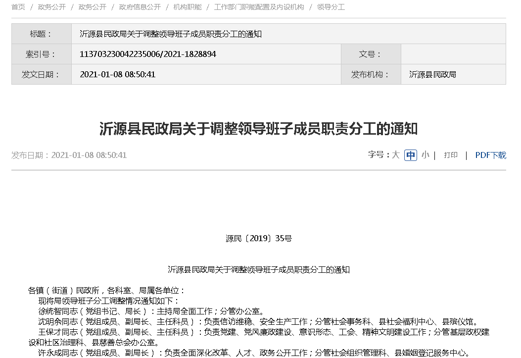 本机关政府信息公开工作机构为:淄博市沂源县民政局